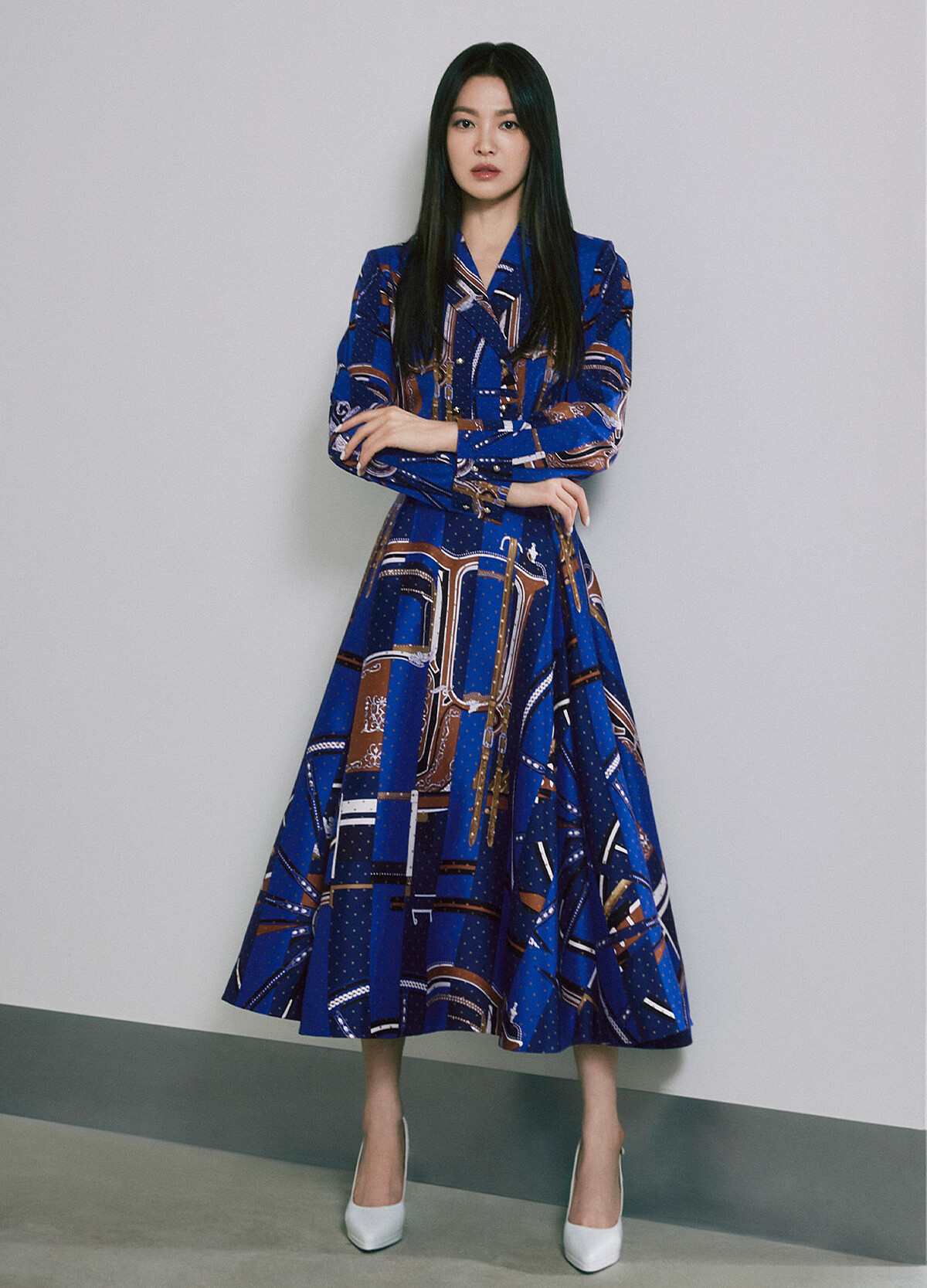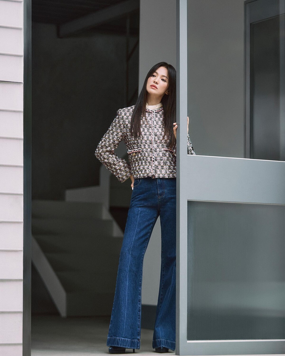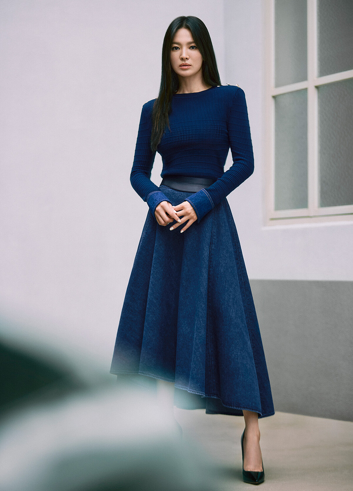 以上的單品對於你來說若過於淑女,那麼請參考參考喬妹的丹寧長裙穿搭——成套的丹寧單配顯得減齡又率性;又或者,與同色調的針織衣搭配出另一番學院知性風。鞋款搭配除了像宋慧喬腳上的包頭高跟鞋,亦可以嘗試矮跟的瑪莉珍鞋、樂福鞋或是貓跟鞋等相對好駕馭的鞋款。