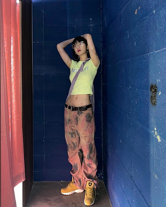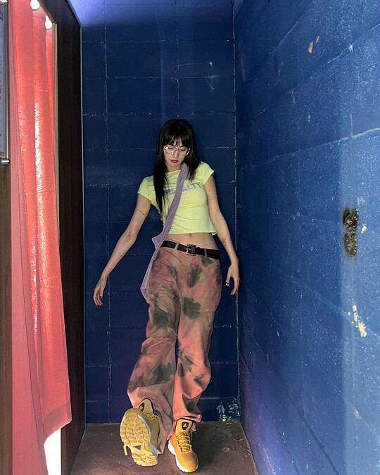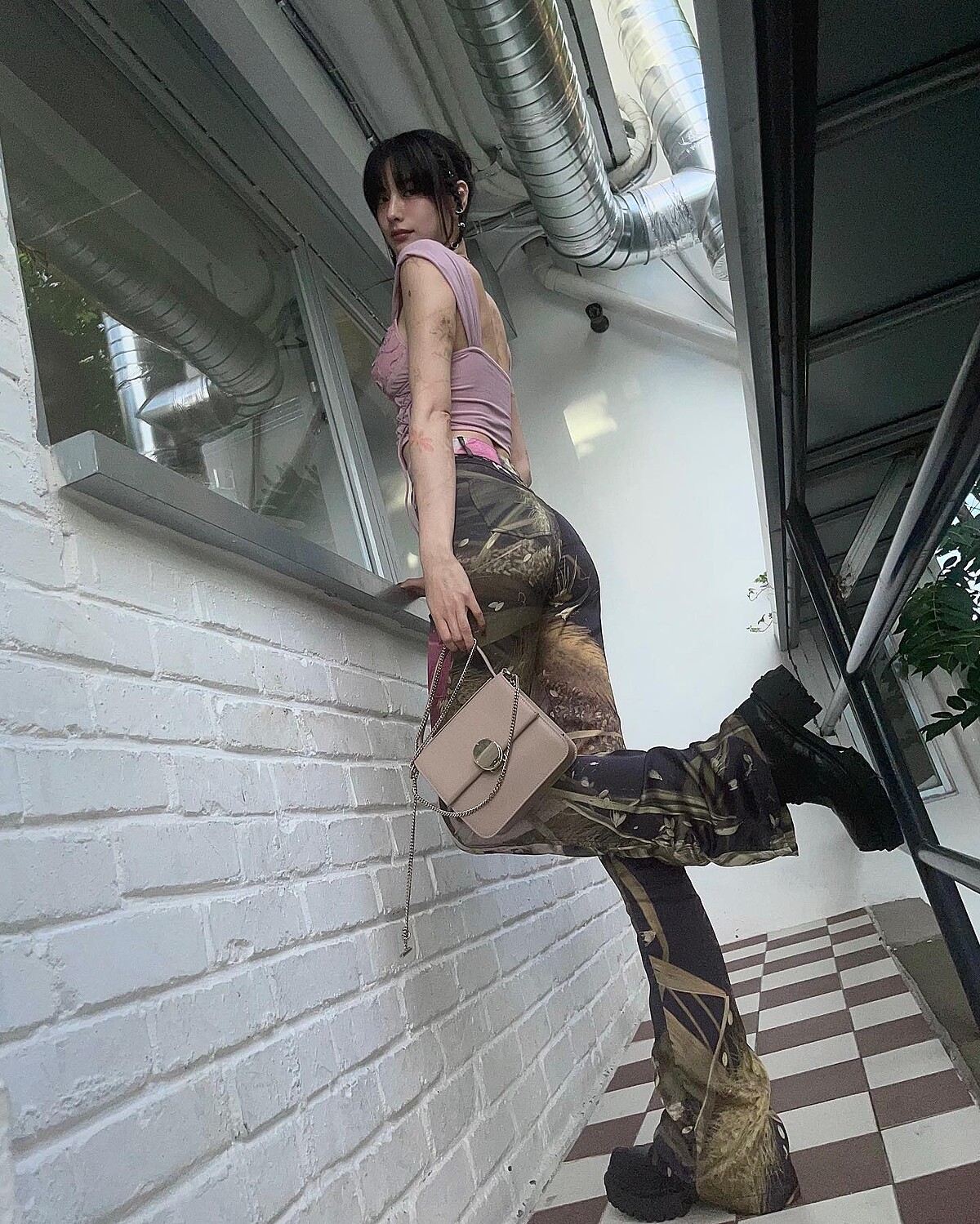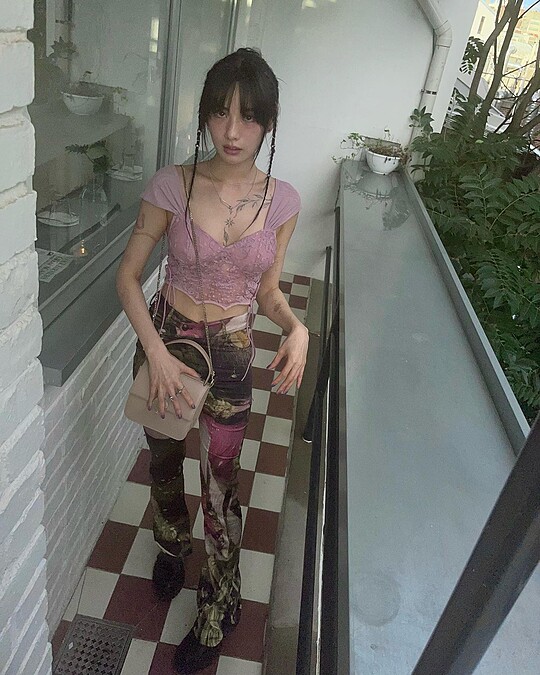 紮染印花帶著明顯的年代感,一個不小心搭配不當或是沒挑好印花設計,造型就容易看起來不知所云。建議可以像Nana從印花中挑其一顏色當作搭配色,像下圖的貼身喇叭褲,Nana選了嫩粉色的上衣+藕粉色的包包與之呼應,看起來就相當和諧。