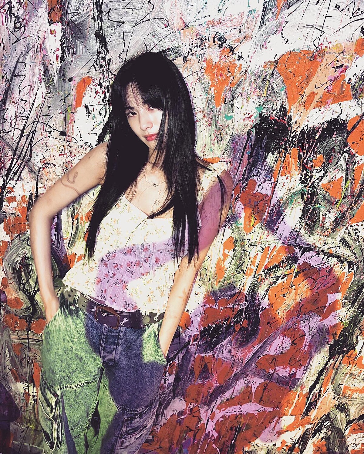 又或是像下圖,參有夕陽橘、灰黑和些許的淡黃色紮染,Nana用最後者顏色的上衣來做為搭配,帶亮了整體的穿搭。而這兩個造型,Nana都運用一雙存在感強烈的厚底鞋搭配,為造型注入更多率性與街頭個性。