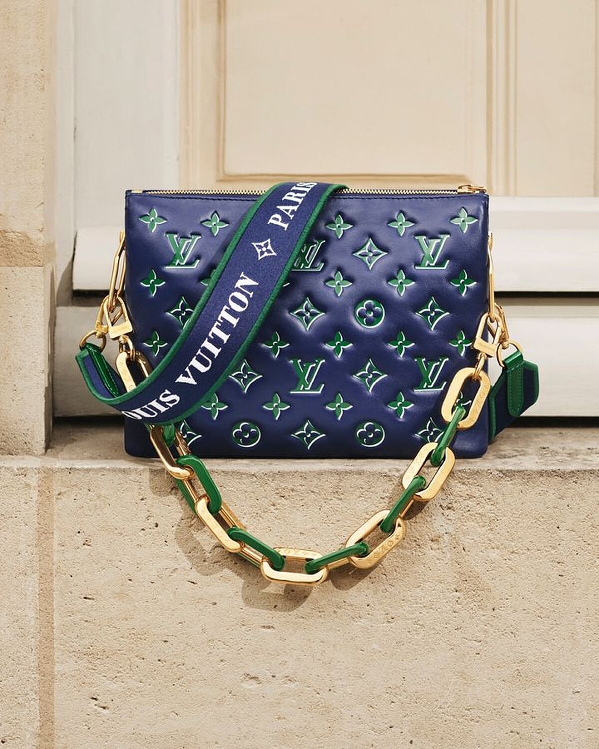 此款Coussin PM採用綠色及藍色的蓬鬆Monogram壓花小羊皮製成,靈感源自於巴黎街道的標誌,是本季包款設計的一大重點元素,手袋設有雙隔層設計,並以內置拉鏈口袋分隔,巨大的金屬鏈條特別有型。