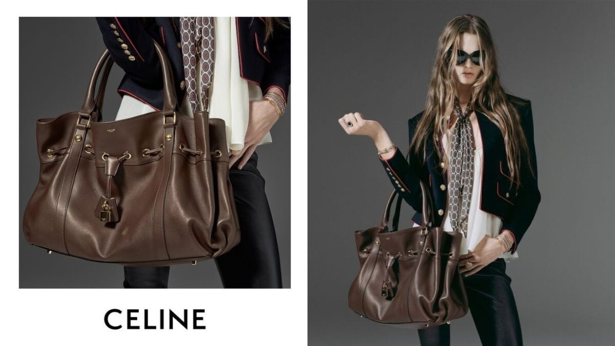 Celine 於 2023秋冬秀場推出的 Abbey 手袋,46 X 32 X 13cm 的尺寸,配置一主要隔層、一可拆卸式拉鍊收納袋空間充裕,以小牛皮鍛造柔軟外表,並配有皮革縮帶可收緊包身,細節滿滿,包含縮帶上帶有的的標誌性鎖頭,無一不彰顯質感。