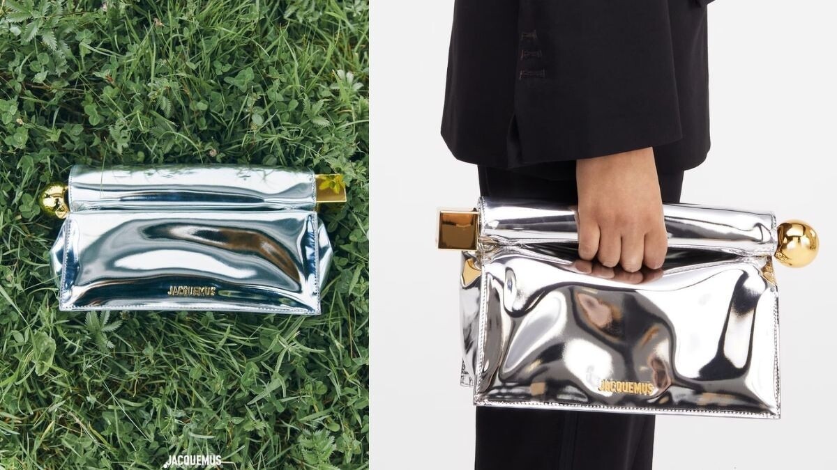 Jacquemus 這款玩轉時髦與摩登風格的 La Pochette Rond Carré 手拿包,因外型酷似外帶紙袋,而也被稱「take-out clutch」,一推出後瞬間在社群上爆紅,配合光線映照的光澤感的金屬漆皮,以大號金色圓形手柄折疊,設計特殊還超有型,個性女孩一定要上手。