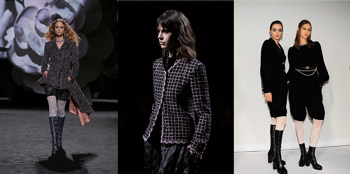 呼應1960、70年代的英倫風情,與借鏡傳統男裝的俐落西裝箭領、外套剪裁,搭配裙襬的不對稱結構、不受拘束的百慕達短褲套裝與貼腿靴、集率性、奔放、優雅於一身的CHANEL女子形象。