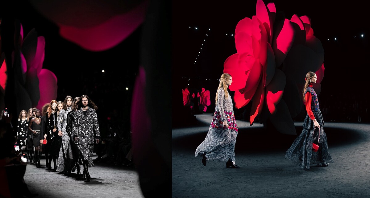 本季系列重點色調由開場的山茶花雕塑和小松菜奈影片的黑白雙色,隨著模特兒繞行出場,山茶花雕塑與模特兒身上的造型服飾也從褪色效果漸變為乾燥玫瑰色,交融出柔軟又強韌的浪漫氛圍,既簡約明確又寓意深遠,最後化作一抹鮮紅在你我心中蕩漾不已。