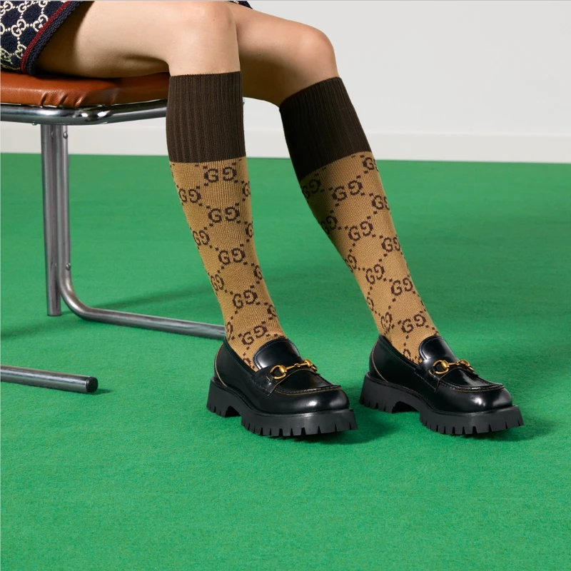 Gucci標誌性的馬銜扣成為樂福鞋上的吸睛配件,象徵與馬術的淵源,且鞋跟還有蜜蜂圖案刺繡,十分精緻時髦,厚底設計一秒增高不是夢想。