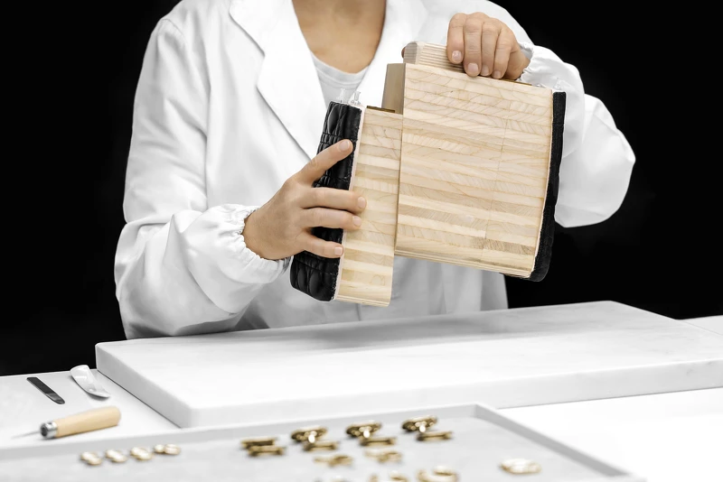 之後,工藝師會在一塊依照 Lady Dior 尺寸製作的木製模板,依序將皮包的不同部位黏著上去,拼成一個立體的 Lady Dior 提包,這個裝嵌技術稱為「續模」,主要功能是為了加固,其中,手提包側邊部份乘載手把與包體的連接,是受力最多的位置,因此要加入一塊皮革來強化,而這個加厚的設計也能巧妙支撐包包的結構,消弭因手把的重量而壓垮包包甚至導致變形的風險。