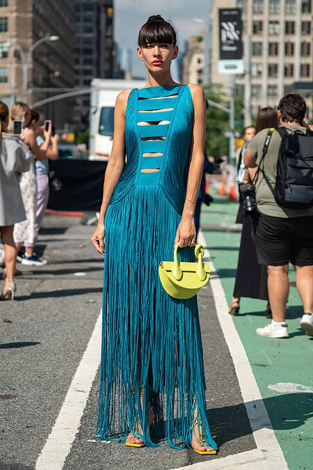 流蘇、鏤空這類本來就相當吸睛的設計,全部置換成絲綢藍加上一個鵝黃手拿包,這身打扮放在哪裡絕對都是視覺亮點。