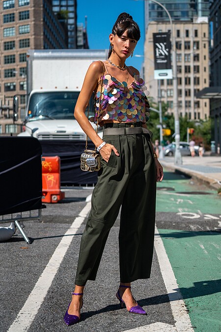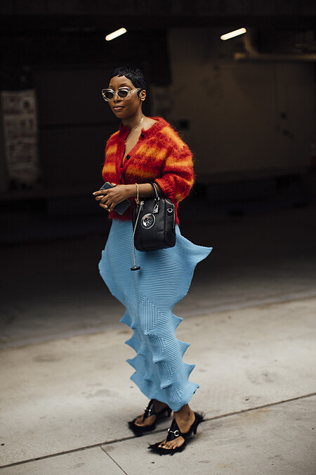 這條藍色不規則魚鰭波浪狀褲子極其考驗顏色搭配,橘黃色的毛衣本身也不是好穿搭的顏色,搭配在一起卻不顯突兀,加上那雙跟褲子簡直一模一樣的涼鞋,這身真的是高手級的單品穿搭。