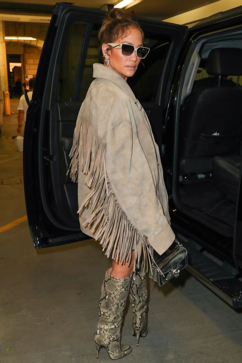首先看到的是 Jennifer Lopez,一件帥氣的流蘇外套加上難以轉開忽略的蛇紋長靴,率性又充滿氣勢,流蘇是屬於帥氣的生命!