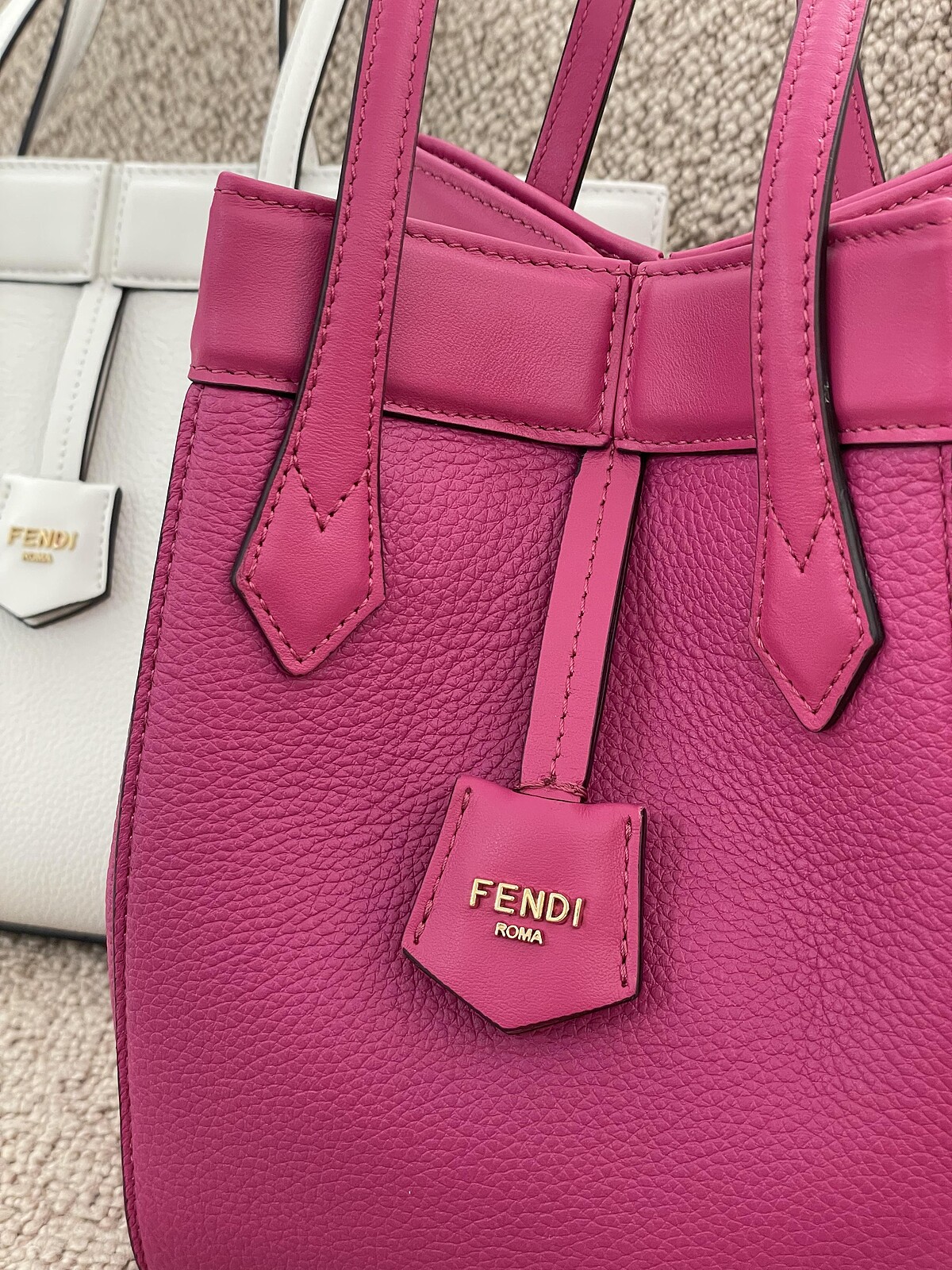 Origami 選用粒面皮革,有基本款黑色、白色與鴿灰色,以及亮眼的桃紅粉色,FF logo 緹花圖案則是採用經典的煙草棕色,同樣的Monogramc花紋也有鋪上翻羊毛皮的奢華材質,編織皮革包面的款式由工匠全手工製作,細膩質感比起素面更加成。