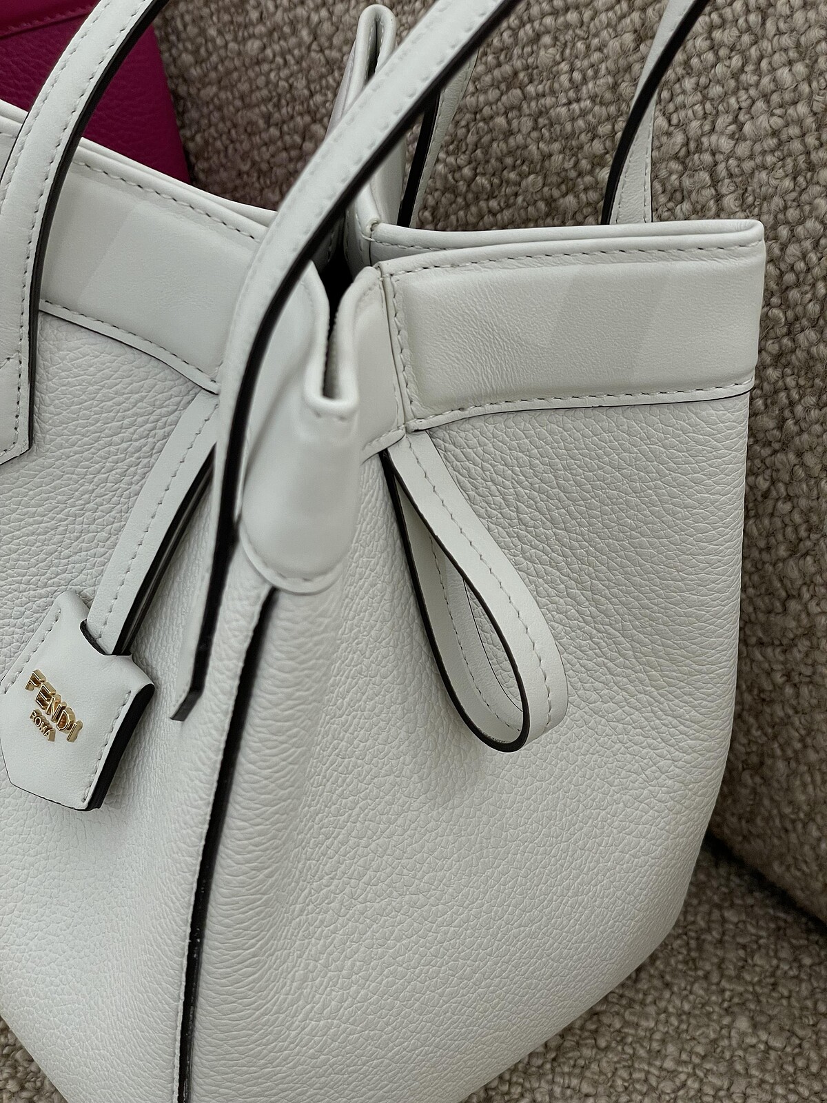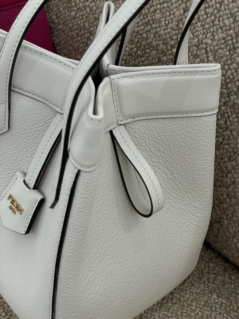 Fendi Origami 包款採用38個零件組成複雜結構,包包最上方開口為靈魂所在,四個邊總共嵌入了8塊磁鐵條,當四邊全向內摺時,包身從上方看宛如花型,形成立體的水桶包身,若是將包包開口兩側拉平,則能一秒變成扁平的托特包,容量也能再更提升。