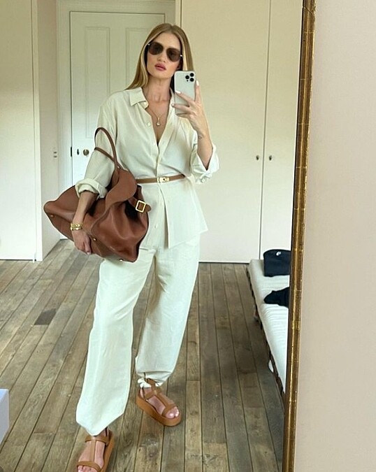超模蘿西杭亭頓懷特莉(Rosie Huntington-Whiteley)的 Instagram 穿搭照中,就可多次看到品牌 Toteme 的單品,比如亞麻材質襯衫與闊型褲,再搭配深棕色金釦細皮帶、羅馬鞋、包包,將整體色系統一、提亮,同時上下呼應並強調腰身。