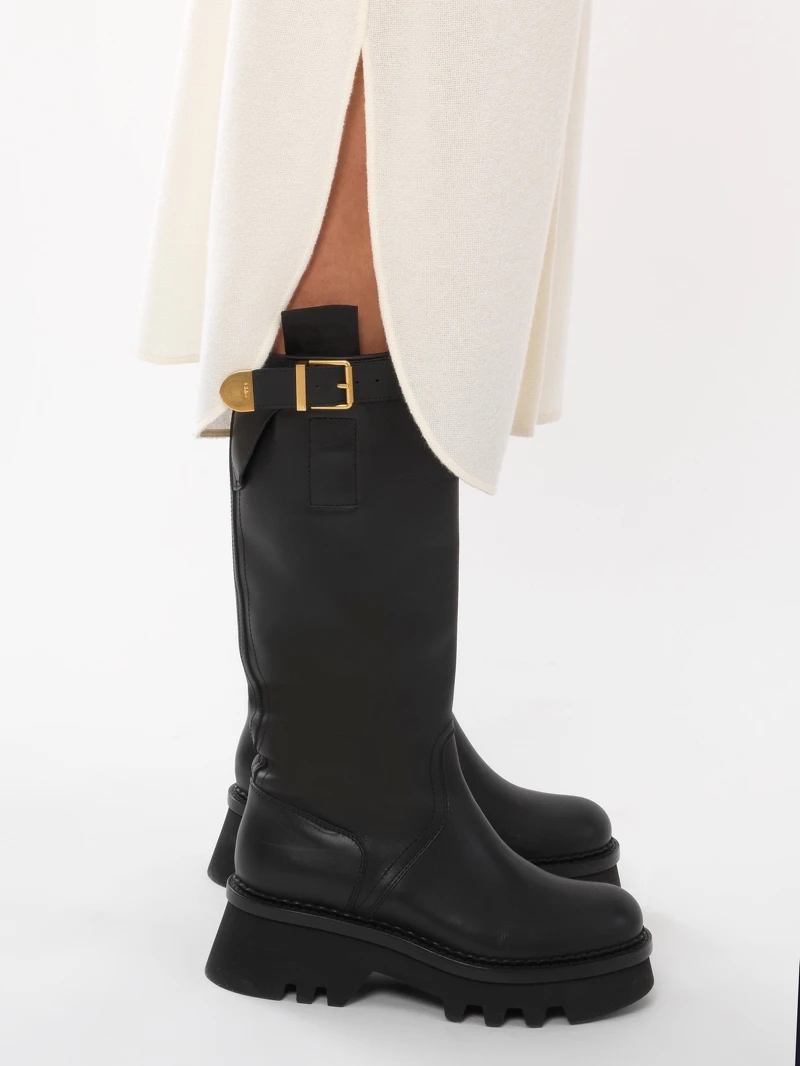 Chloé在2023秋冬show look中運用大量的靴款搭配造型,其中這雙厚底設計的中統靴,展現了女性陽剛強硬的一面,能為穿搭帶來衝突與凸顯個性的風格。