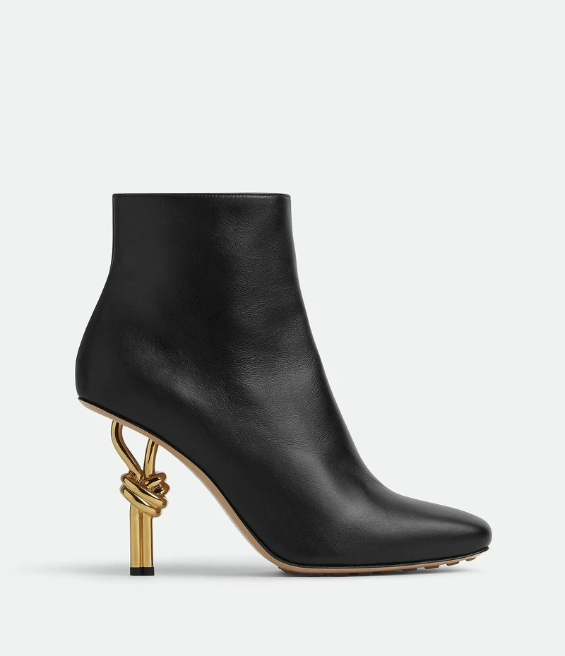 Bottega Veneta 招牌的扭結運用於金屬鞋跟,搭配上簡約俐落的短靴廓形,是一雙基礎又不失亮點特色的選擇。
