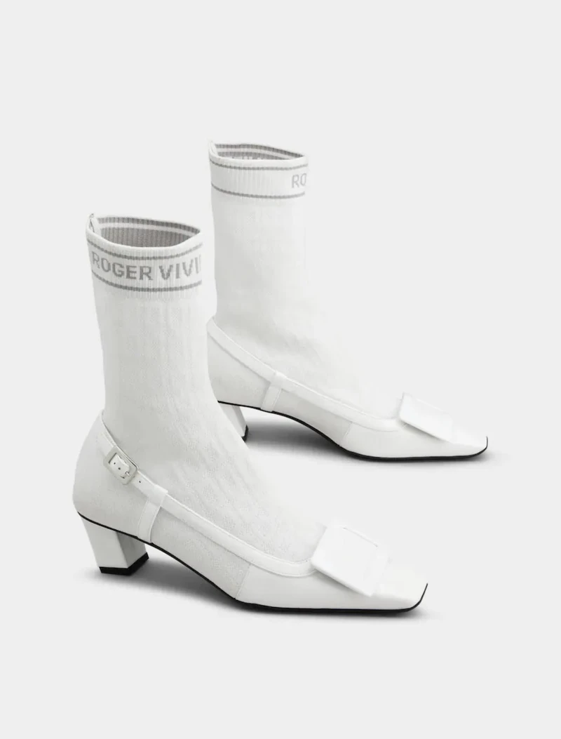 這款低跟襪靴非常優雅,靴筒為布滿 Roger Vivier花紋的針織面料,招牌的方形飾釦以同色鍍漆營造整體感,呈現的是低調高級的氛圍。