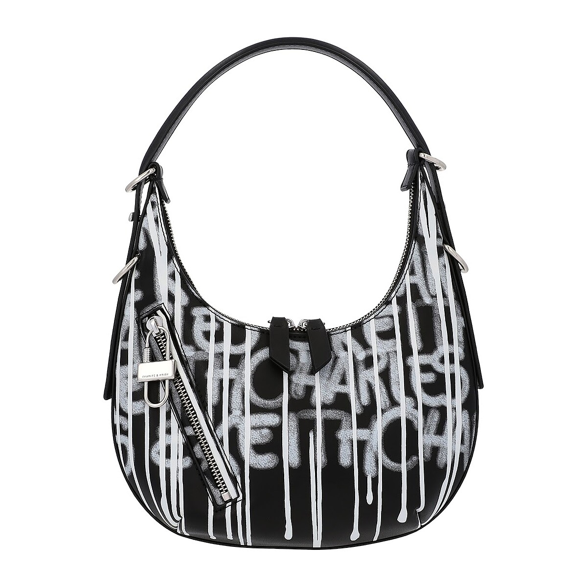 今年特別流行的Swing包款,新增了這款黑白塗鴉風格的款式,白色的英文字母噴漆圖樣,連噴漆滴落流下的痕跡都呈現出來,很有街頭感,適合帥辣的搭配風格。