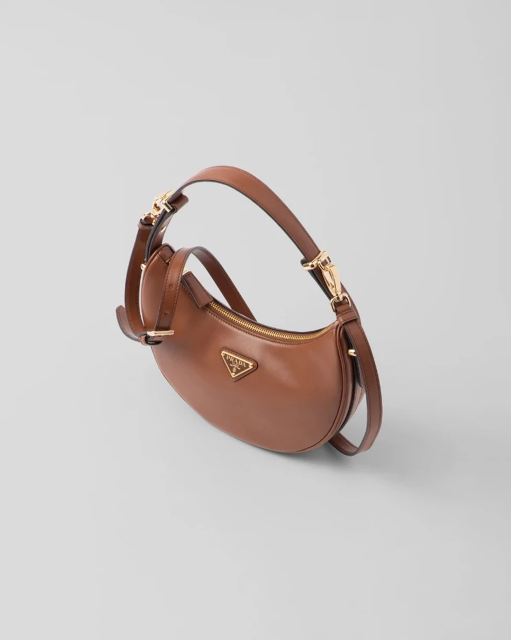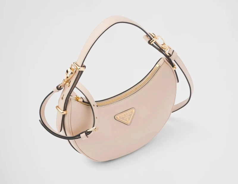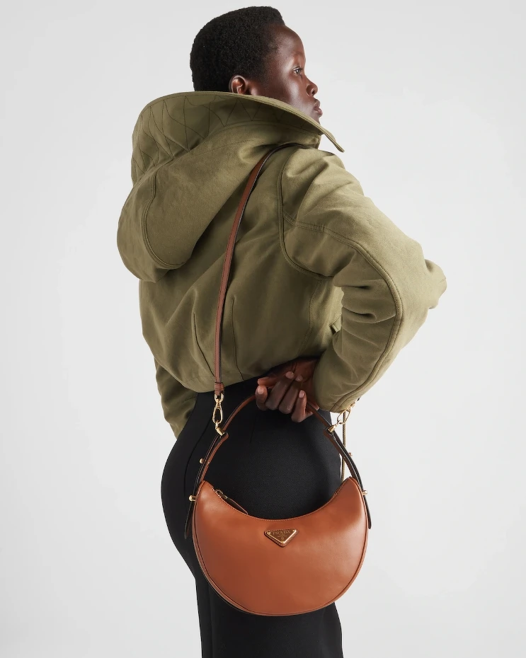 全新 Prada Arqué 包款由木製模具為包身結構塑形,採用獨特新月廓形,並與皮革肩背帶相連而成一個橢圓形狀,圓滑的曲線凸顯了Prada擅長的幾何美學,同時延續了Hobo包款的雋永設計,以柔軟小牛皮包身與納帕皮革襯裡製成。