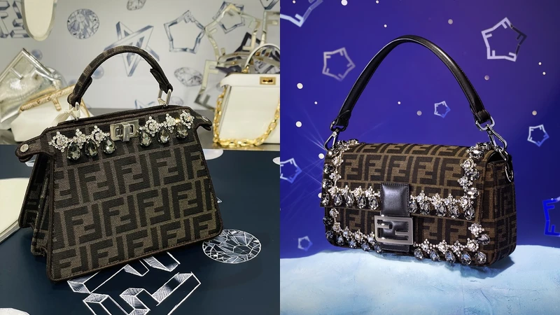 Fendi Peekaboo與Baguette手袋上,以經典不退流行的煙草色 FF logo 圖案佈滿帆布材質包身,邊框處妝點著大顆、小顆的水晶,組合成奢華的圖騰,典雅而不過於囂張!