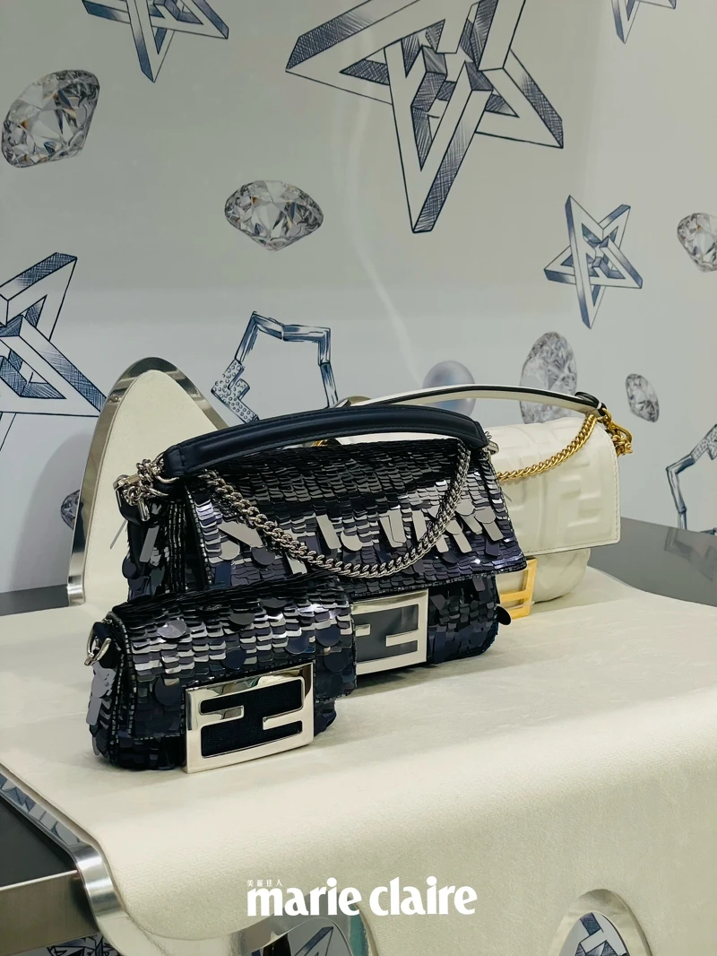 充滿歡樂氛圍的派對假期,絕對不能少了亮片元素,Fendi這回將Baguette裹上滿滿亮片,由長形和圓形的亮片緊密層疊在包身表面,隨著角度折射出深藍或銀色的漸層光澤,擔心亮片不好保養的話,這款手袋的亮片是運用鋼材質所製作、不易有摺痕,使用起來更放心。