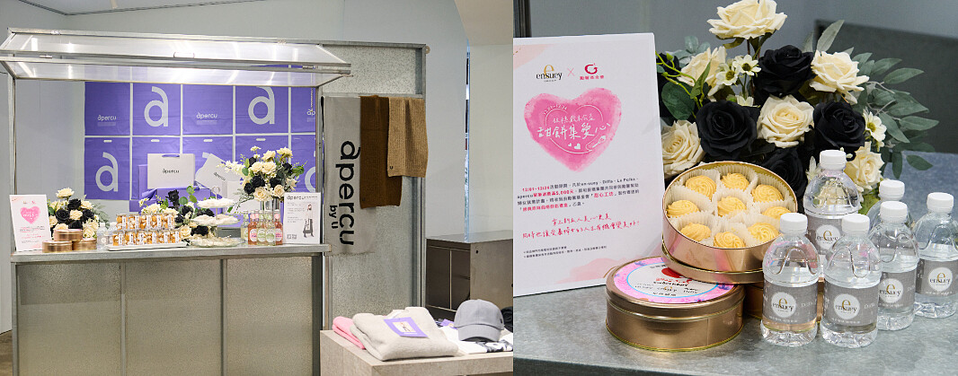 年末送暖的溫意氛圍感,也出現在apercu體驗店中,apercu所隸屬的銀穗集團為了回饋社會,和勵馨基金會─甜心工坊合作企劃一場公益活動,為弱勢婦女就業計畫盡一分心力。這次也在apercu體驗店呼籲大家一同響應,只要消費滿NT5,000便參與了勵馨基金會的婦女就業計畫,將收到甜心工坊寄送香酥鬆軟「經典原味曲奇餅乾禮盒」乙組,讓女性從內在到外貌都擁有美好狀態。