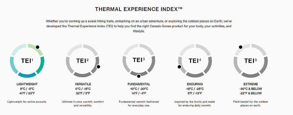 講究功能性服裝的當代,Canada Goose 將羽絨系列商品,從TEI1到TEI5細分成五種溫度體感指數(Thermal Experience Index),其中分別為TEI1輕量級、TEI2通用級、TEI3基礎級、TEI4 持久級和TEI5極限級 ,這樣的區分能依照5°C 到-30°C 的氣溫選擇適合的單品,無論是因應一般的冬日旅行或是前往極地探險,都能從容應對。