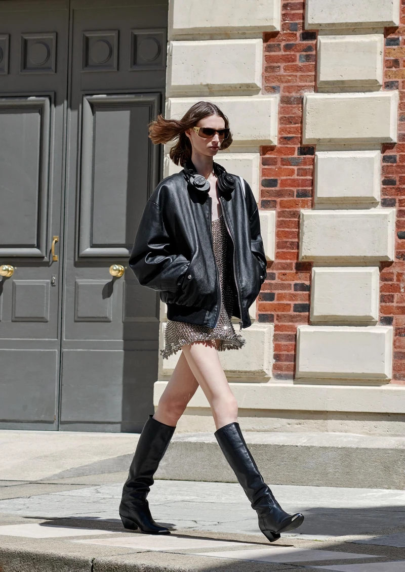 2024春夏女裝,Hedi Slimane 再次帶來一場文化饗宴,模特兒一身極度性感結合帥氣叛逆的時髦輪廓,明顯抹去性別與時裝的界線,也娓娓道出本季雌雄同體「TOMBOY」中性風格的強烈宣言。無論是輪廓寬大的剪裁夾克、西裝外套、方形短版外套搭配透明蕾絲襯衫,或是毛茸茸豹紋外套配上復古喇叭牛仔褲和Y2K迷你裙,這些揉和搖滾龐克與潮流元素的裝束,都完美示範了現代混搭風格的美學,而由工坊手工製作的數套高級訂製禮服,除了展現出品牌頂級的製衣工藝,絕對是本季頂流搭配參考的注目亮點,一如俐落剪裁的訂製豹紋夾克,搭配低胸蕾絲細肩帶上衣、Oversize的落肩皮夾克外套,搭配手工刺繡水鑽短洋裝,其中一件以手工製作的繡花緊身連身裙,綴有成千上萬的亮片,猶如暖陽乍現,閃亮耀眼。