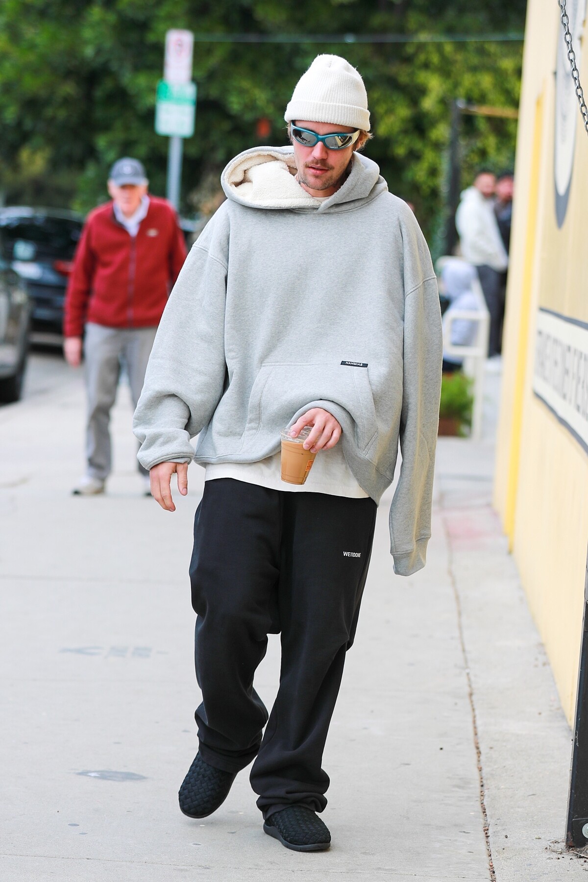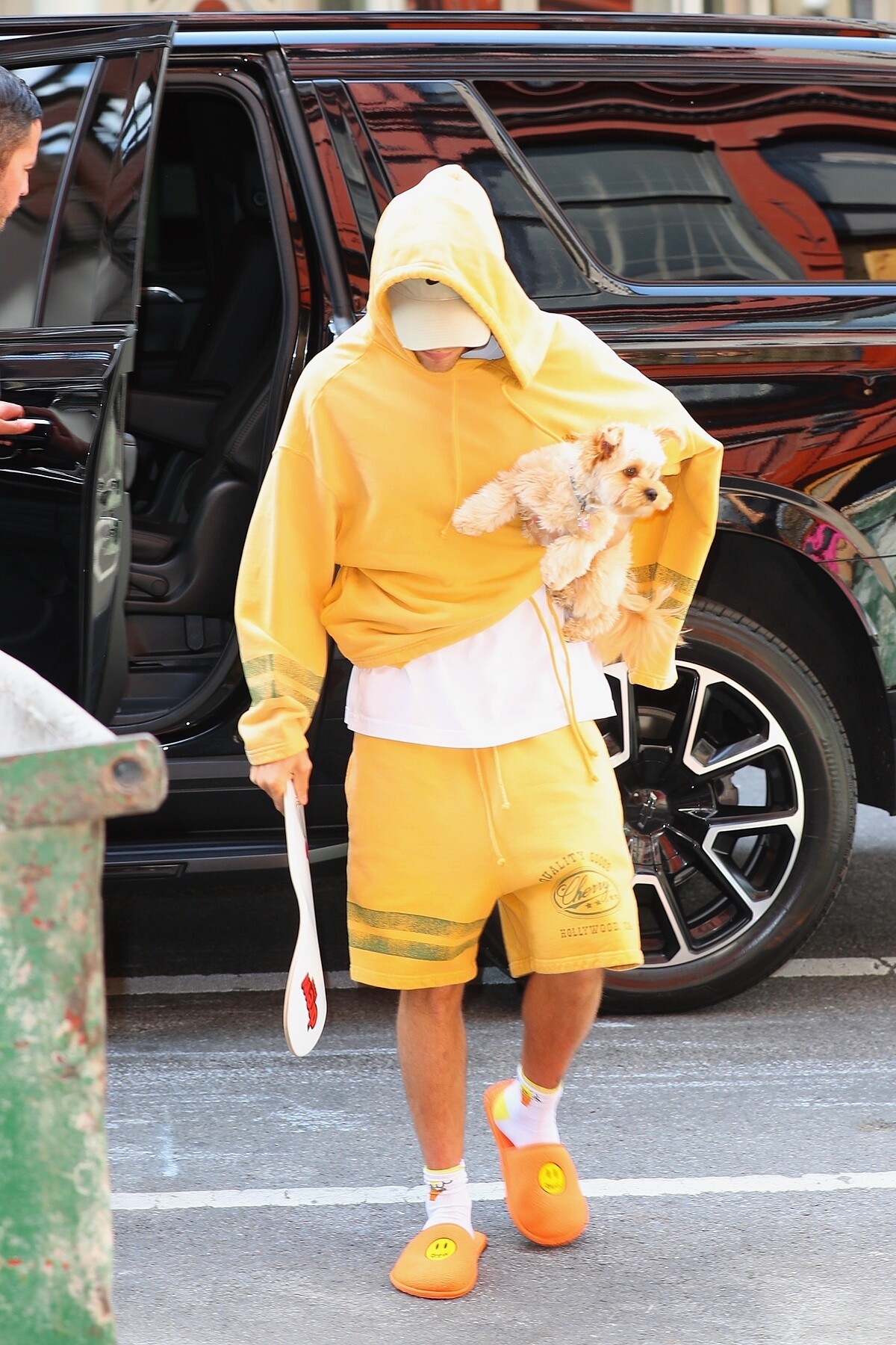 像這樣只穿單手的新奇帽T穿法,其實並不是小賈斯汀第一次嘗試,近期他與老婆海莉比伯Hailey Bieber在比佛利山莊上街時,身上的帽T也只穿進了一隻手、另一手拿飲料;還有,抱著狗狗時他也曾這樣穿。