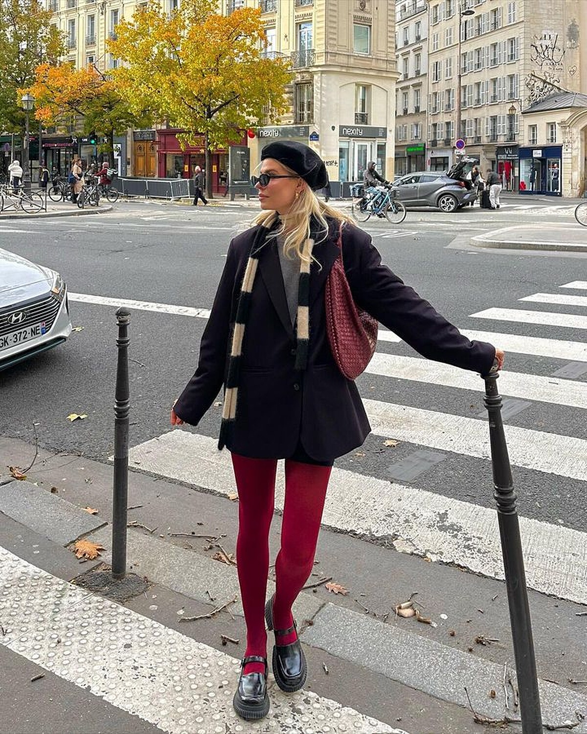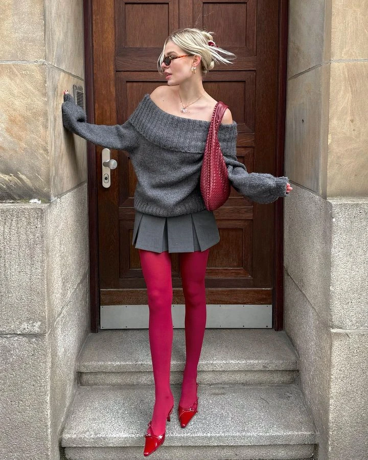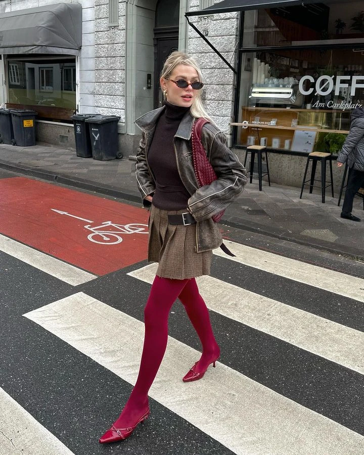 搭配紅色褲襪時,掌握整身色系控制在兩種以內的原則,即不易失誤,其中紅色x深色更是不會出錯,像允真一樣全身服裝以灰色系為主,讓亮點聚焦於紅色的雙腿,並用同色系高跟鞋來延伸視覺,便不會顯得突兀。國外博主們也經常選擇深灰色或是黑色的上衣、外套來搭配紅色褲襪,日常能駕馭又能顯現時髦品味,此外,美拉德色系與紅色褲襪的搭配,也是不錯的選擇。