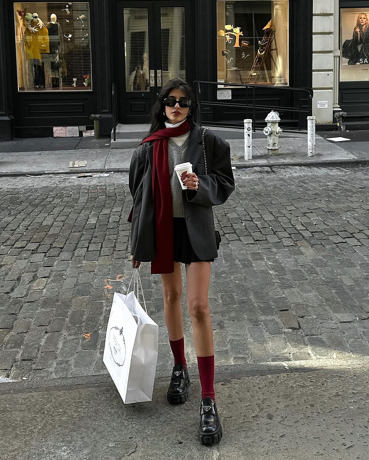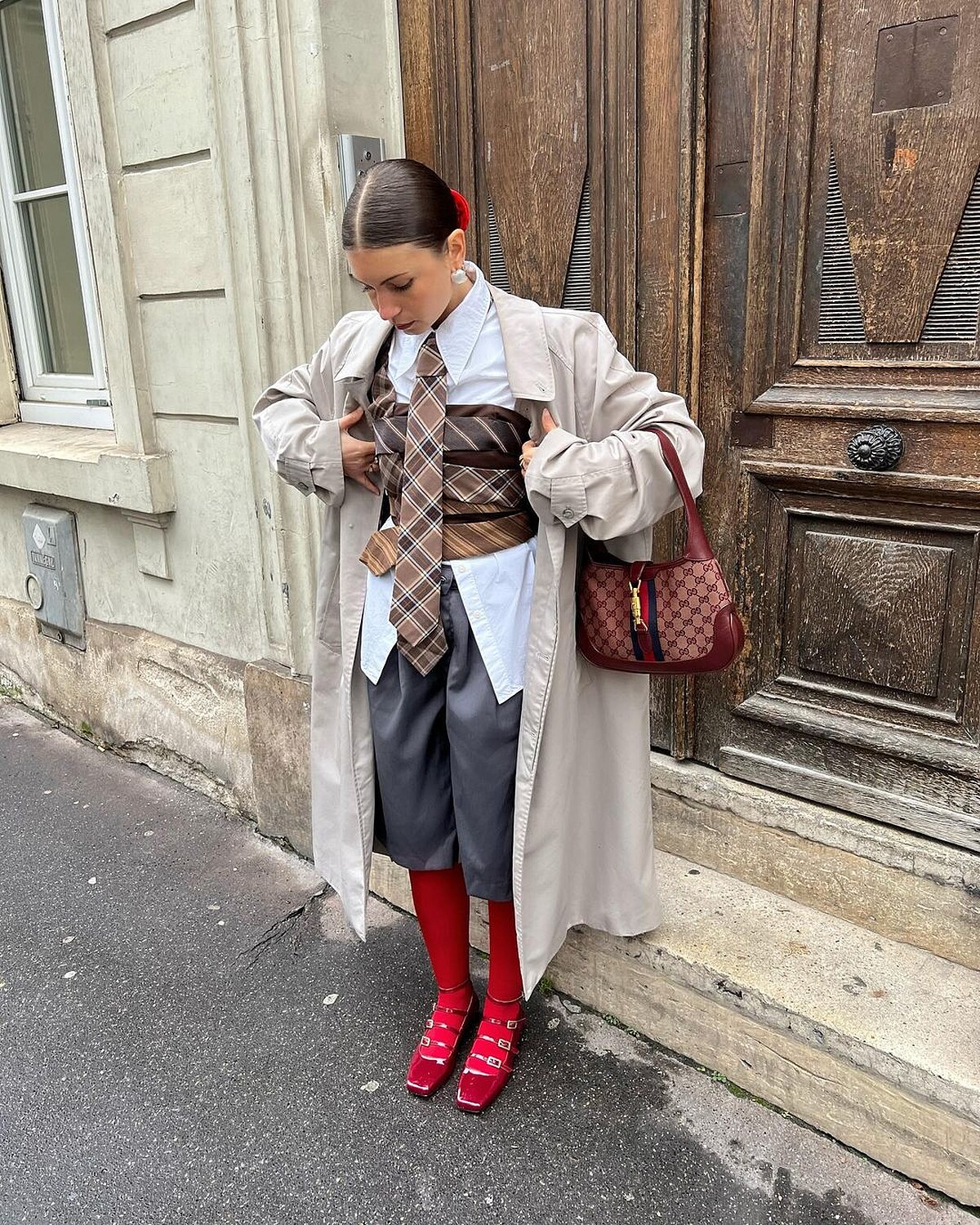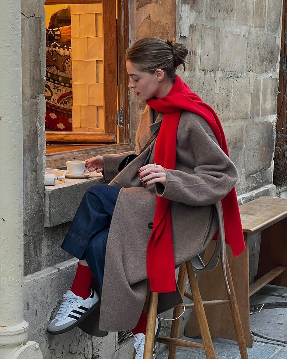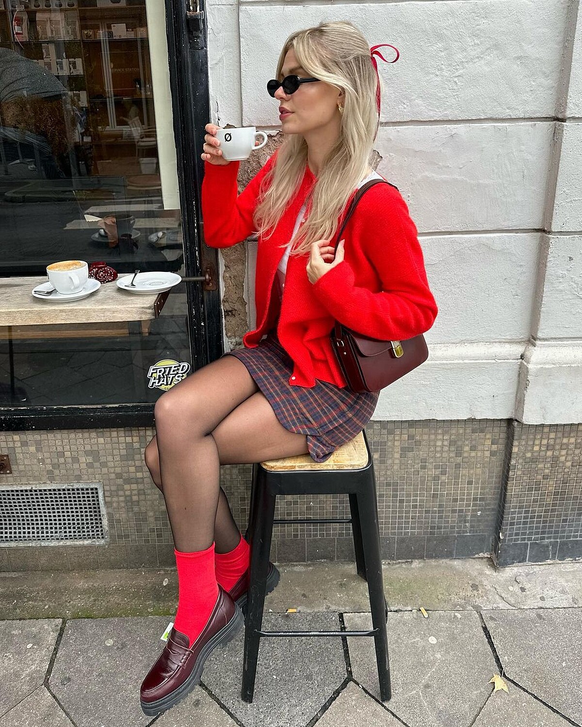 如果整雙腿都被包成紅色讓你感覺難以駕馭的話,可以試著先從紅色襪子開始,像是海莉比伯Hailey Bieber就以紅色長筒襪搭配瑪莉珍鞋,紅色襪子穿在褲裝內、彎腿時不經意露出,也是一個時髦的小亮點,搭配樂福鞋則能跳脫乖乖的學生氣息。