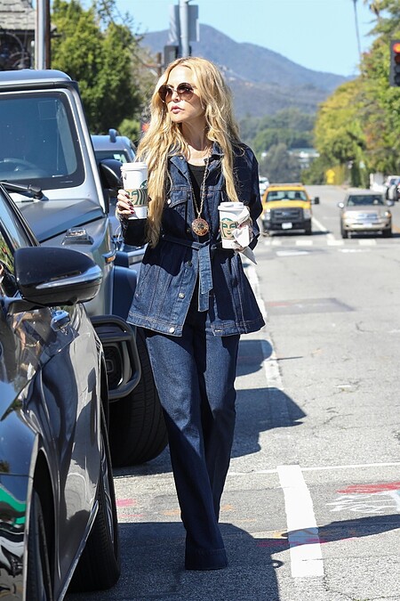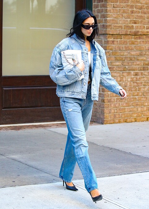 以Denim On Denim的方式穿搭的牛仔外套,搭配上一雙俐落的尖頭高跟鞋,氣勢十足。