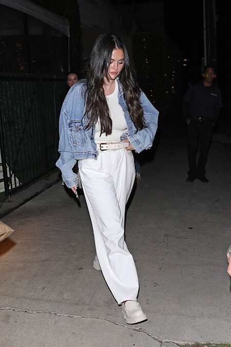 打折的西裝褲型搭配上西裝外套,也是非常適合,而賽琳娜一身白色系的裝扮搭配上藍色牛仔外套反而讓造型有了重點。