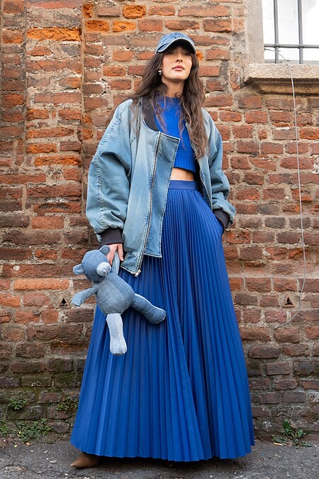 澎湃的百摺長裙套裝,也能搭配上牛仔外套,再搭配上一頂棒球帽,直接讓太過正式的風格有了街頭混搭感。