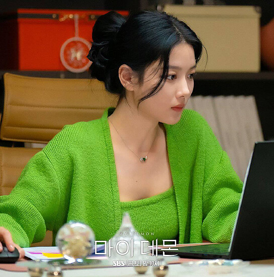 都到曦認真工作加班的一幕,她選穿了一套亮眼草綠色的針織套裝,並運用一條綠色寶石項鍊來點綴胸口,呼應相同的色系。Swarovski Mesmera 鍊墜由3顆不同形狀切割的鋯石組成,中央寶石則替整體增色,戴起來相當優雅。