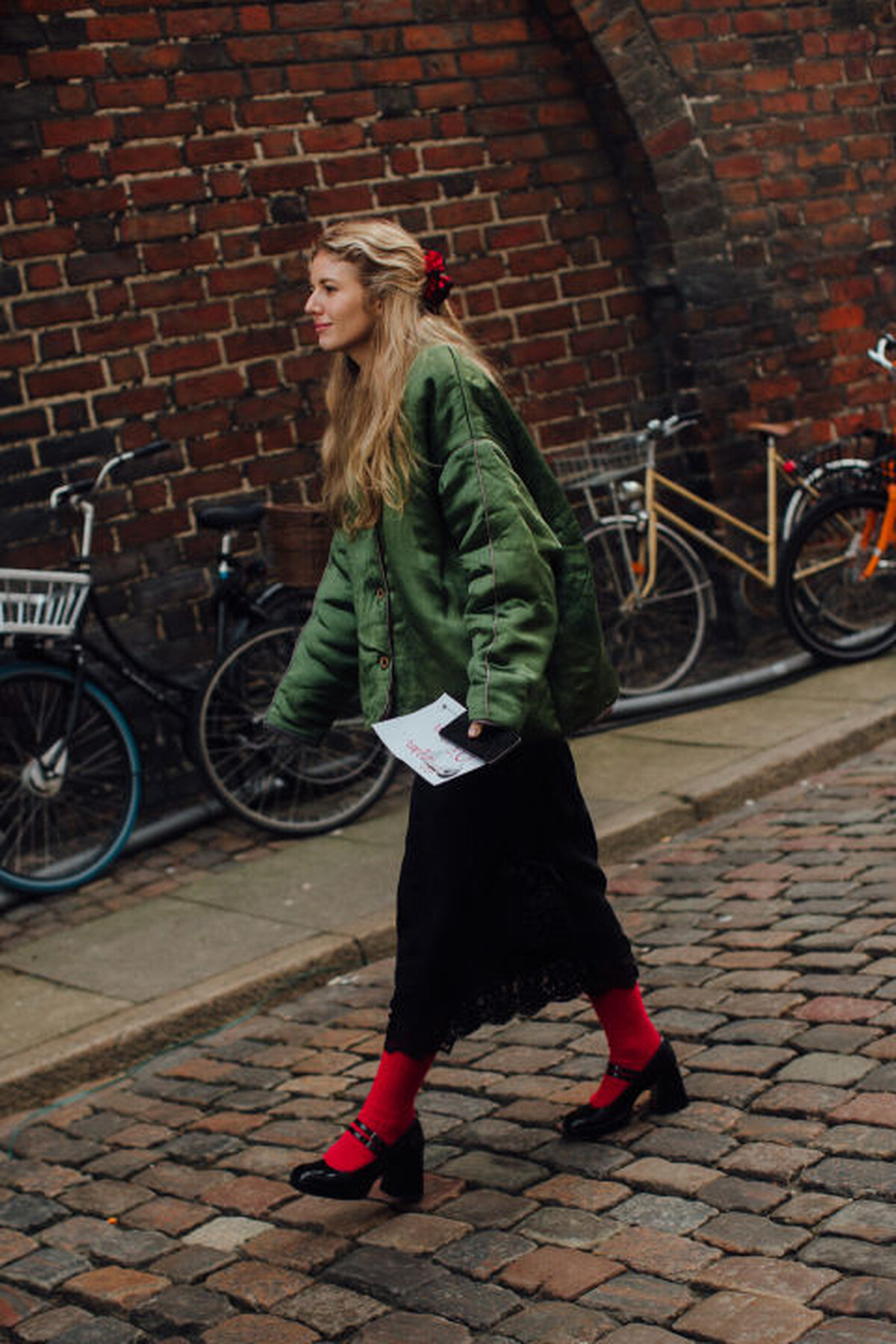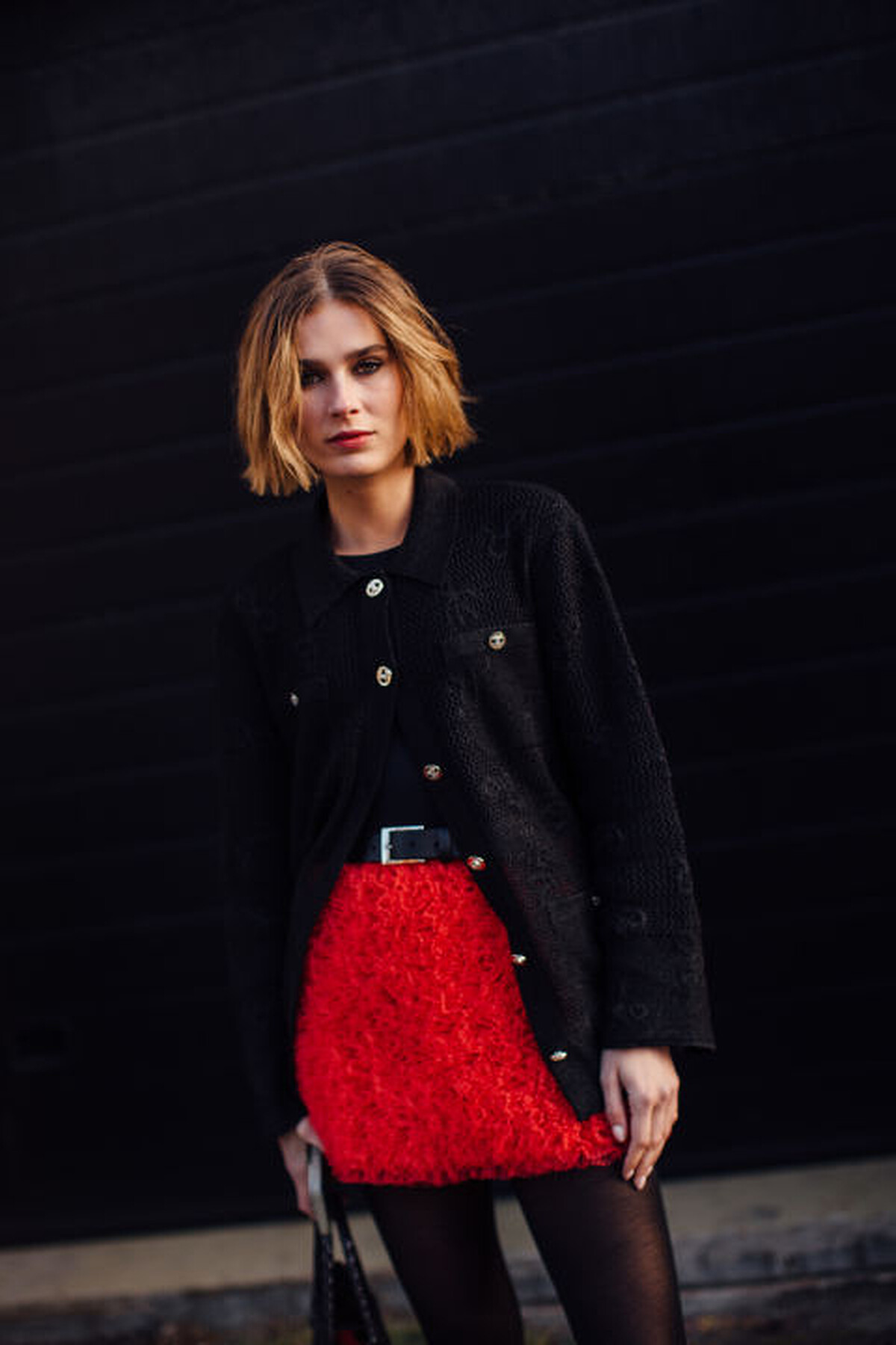 如果覺得整身紅色調太過亮眼,不妨將上身換作深色調,下身一樣運用正紅色裙裝作亮點搭配。