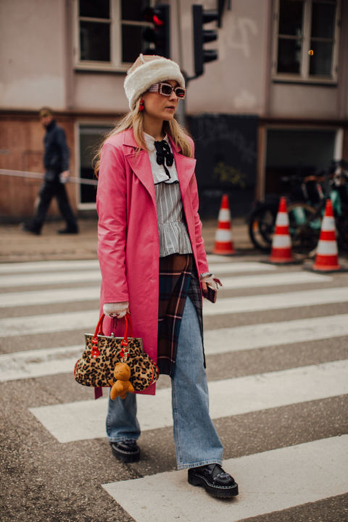 皮質外套在今年也是重點單品,除了深色皮革外,一件亮眼的粉色大衣會讓你的造型充滿活力。