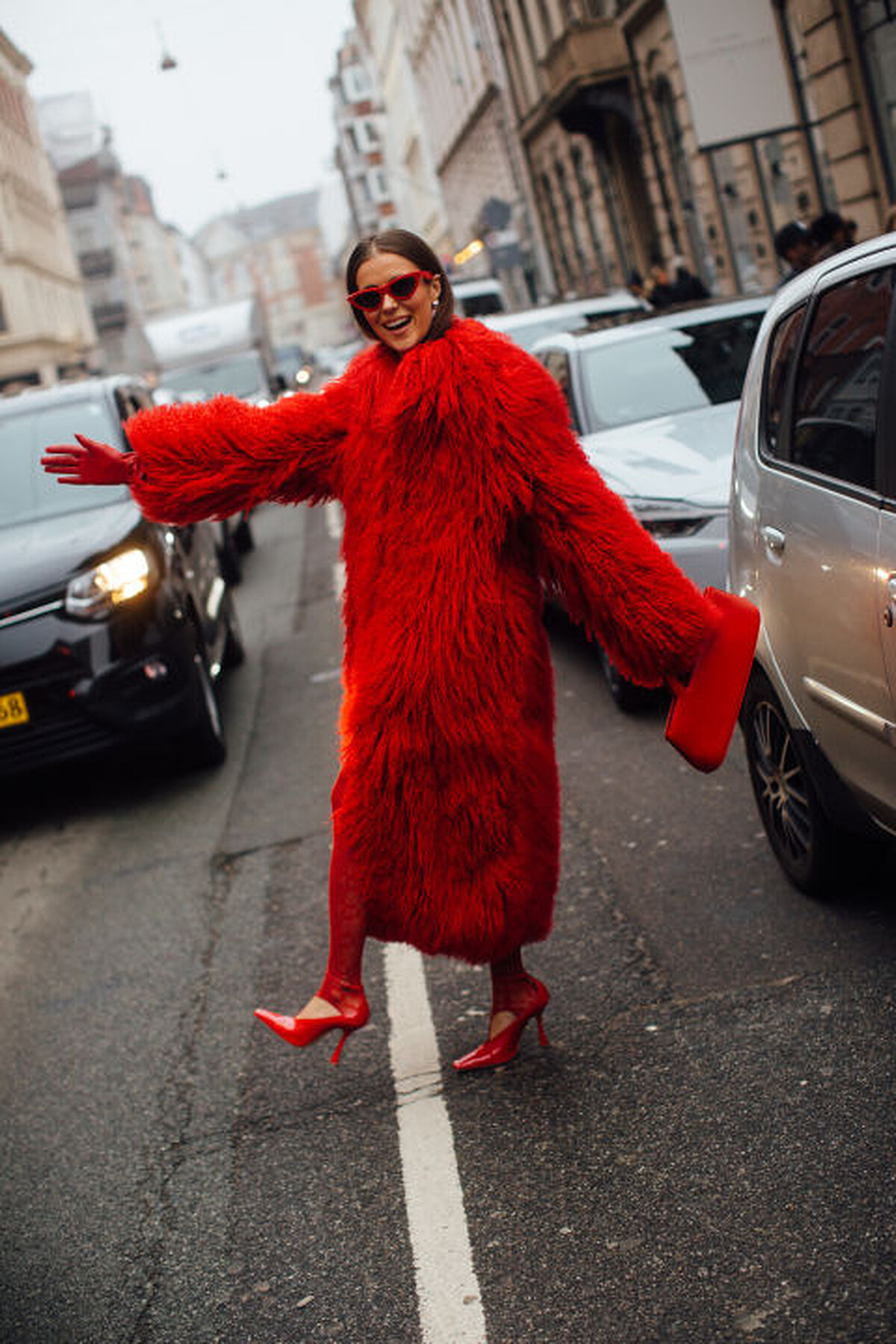 整體以紅色系為主,上身搭配軟料的圍巾與針織衫下身則以淡粉色平衡整體,符合年節氣氛又不失優雅。