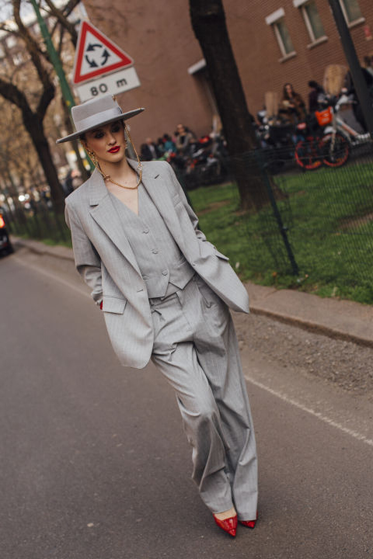 可以選擇今年依然火紅的落地寬褲搭配同色系造型,讓整體比例更修長。