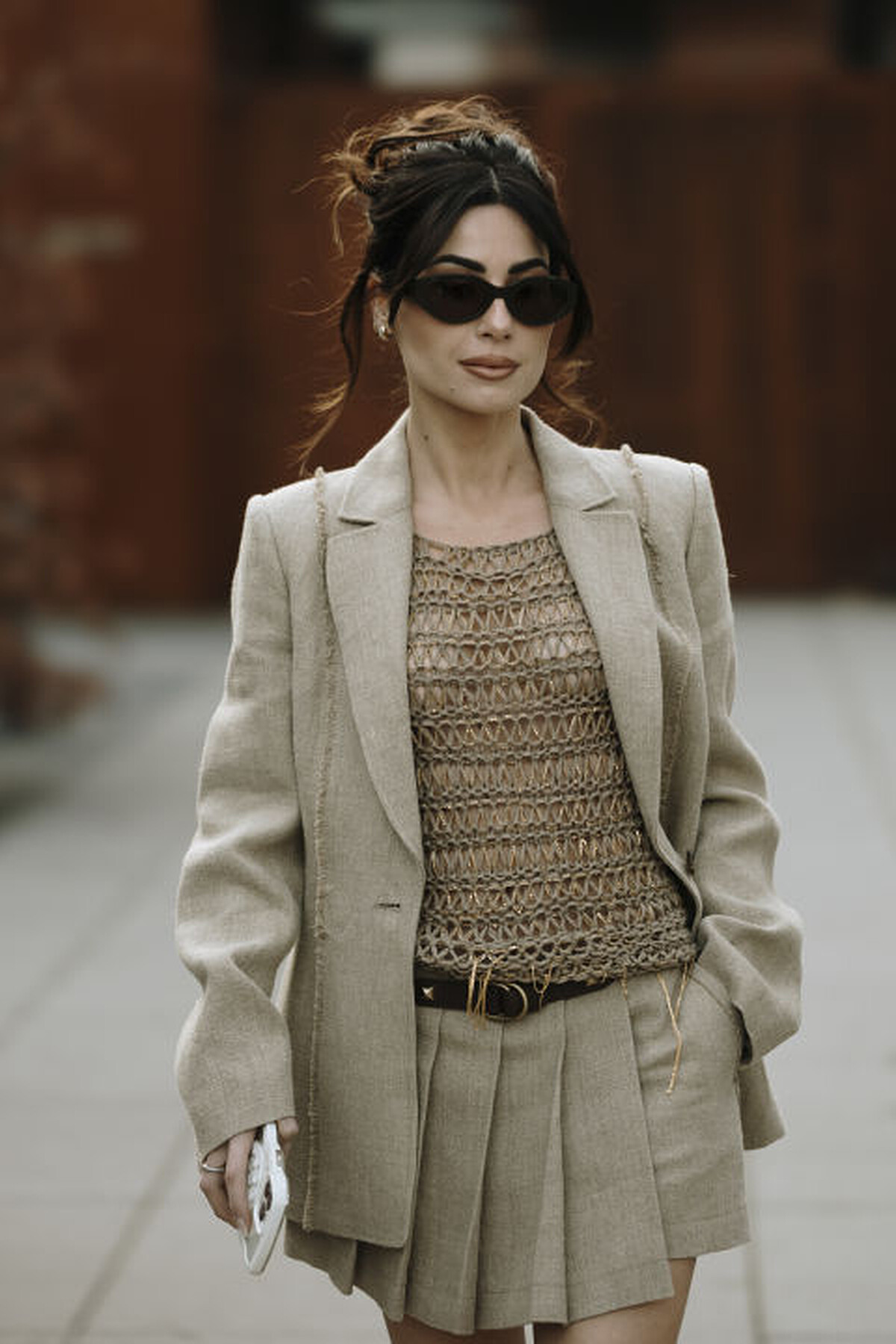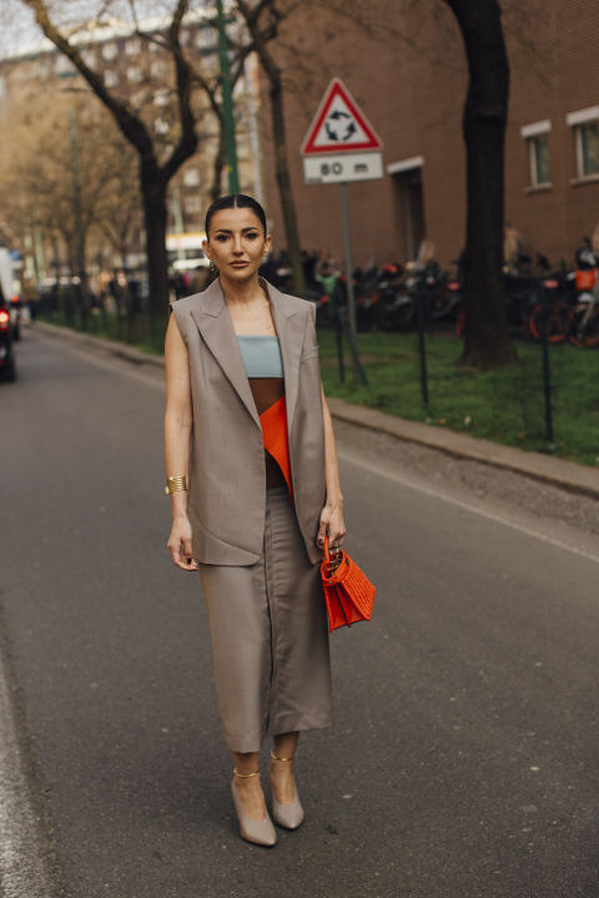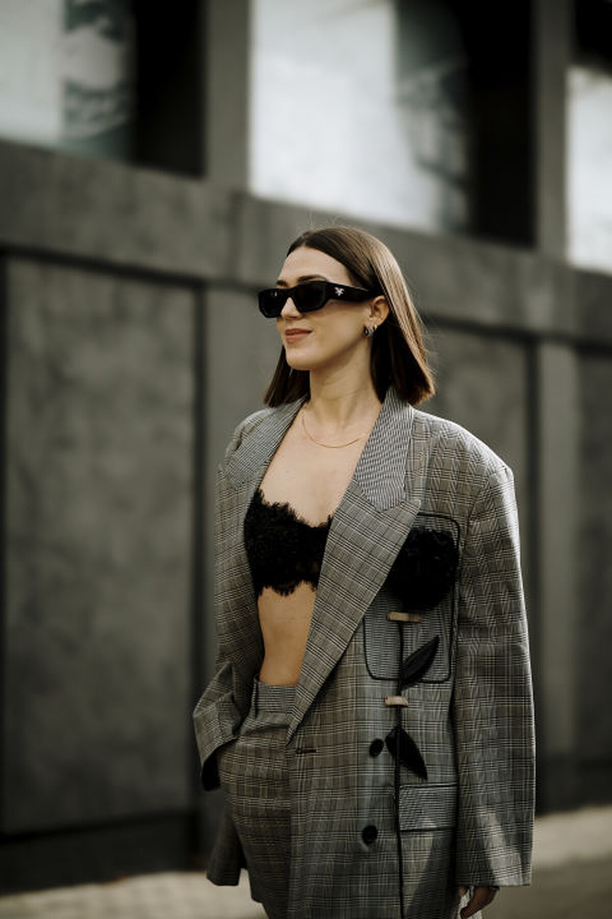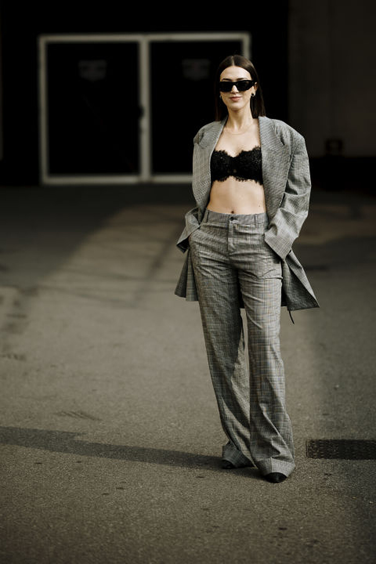 避免成套正裝過於正式,選擇寬鬆剪裁的款式,內搭素色 Bra Top 或 Crop Top 上衣就能展現俐落的性感時髦風格。