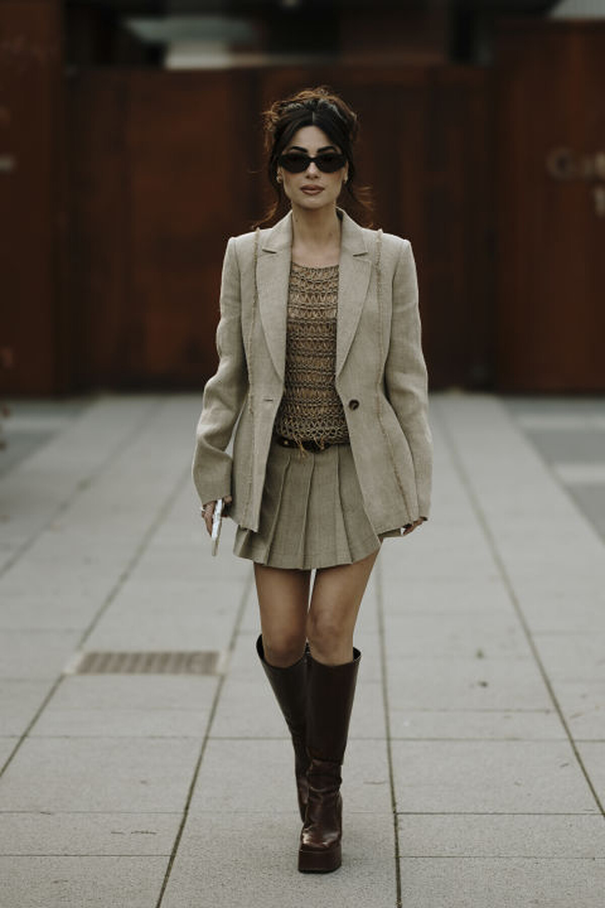 西裝外套搭配短裙是時髦女人的入門好選擇,同色系的單品搭配一雙及膝長靴就能展現俐落率性的女紳士魅力。