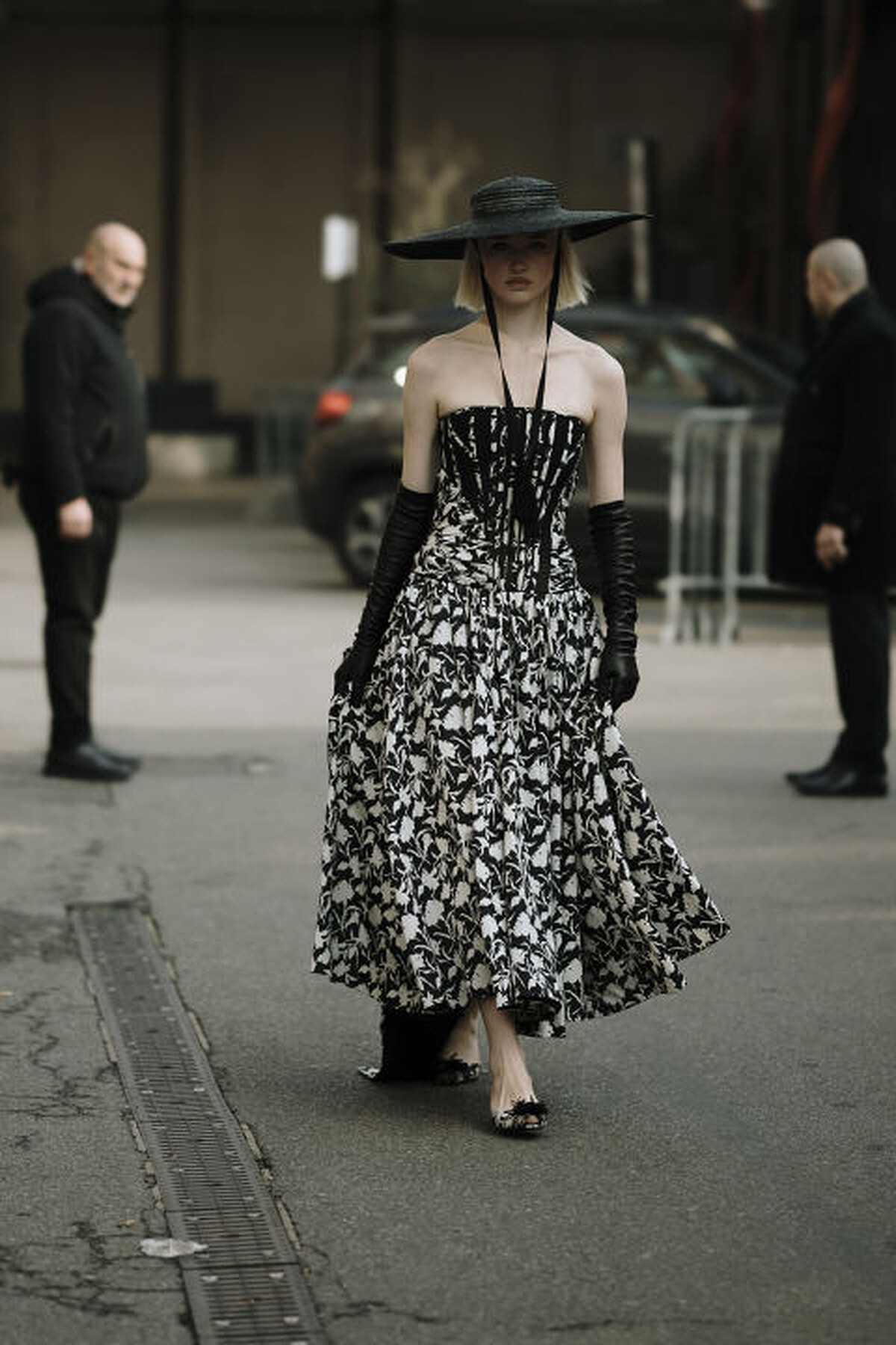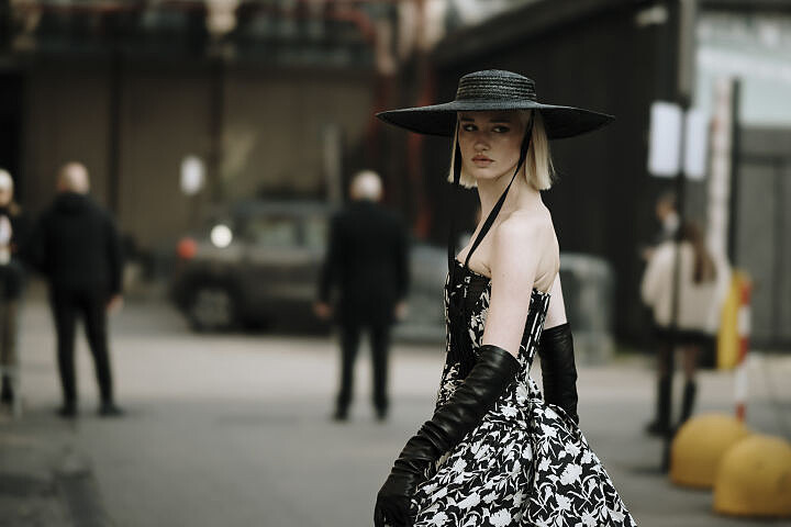 平頂禮帽總帶給人們一種端莊優雅的印象,在春季造型中搭配墨鏡能搭出現代摩登感,簡單的黑白色系就很有型。