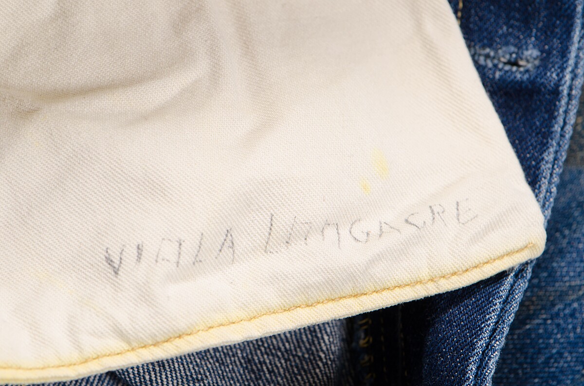 在三○年代,還是學生的 Viola Longacre 穿著此褲在加州學校外的塞拉山國家森林中活動,耐磨的特質讓他時常穿著,內袋更繡有他的名字。