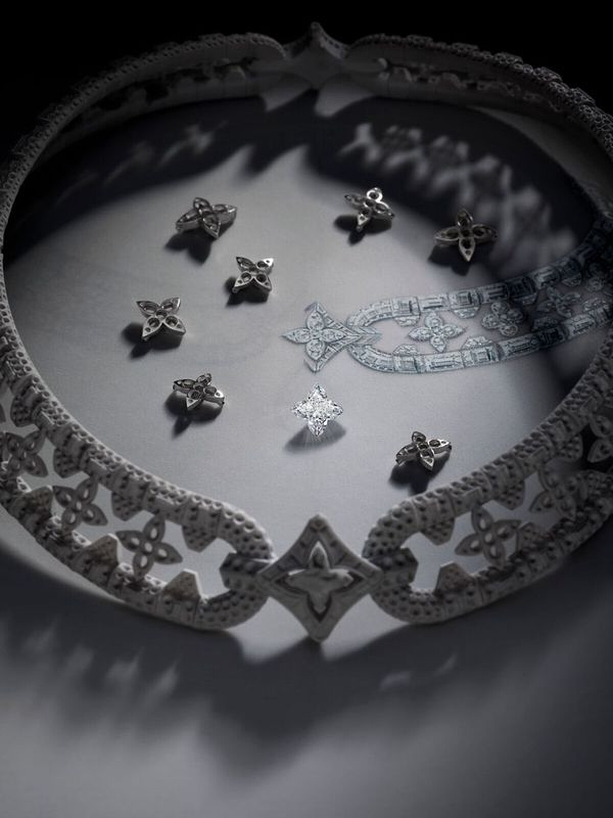 最後來到了「 Flowers 花卉」的呈現,設計師將花卉以白鑽鑲嵌在白K金上象徵著路易威登 Monogram 的輝煌與品牌底蘊,連結了過往、現代及未來。