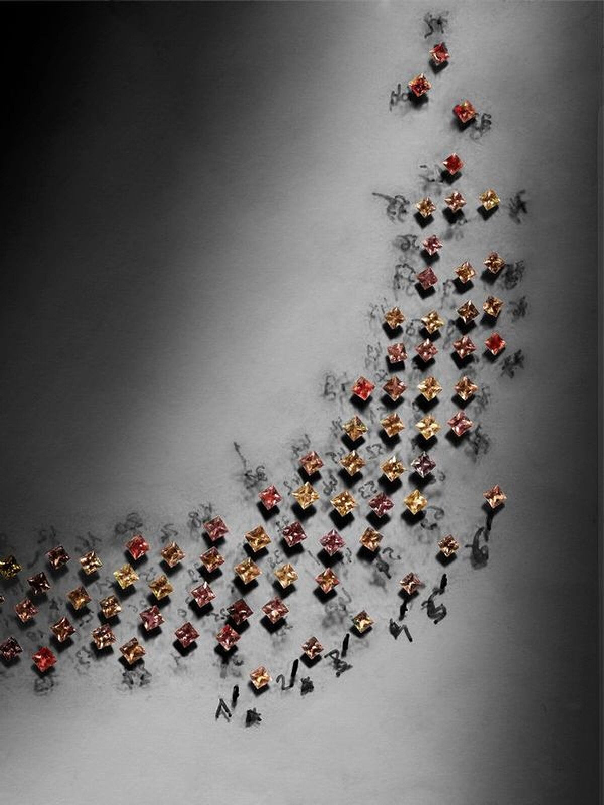 設計師 Francesca Amfitheatrof 運用黃鑽和貴金屬呈現「Laurasia 勞亞大陸」意象,有著奪目且對比鮮明的色彩,此手法更是 Amfitheatrof 的拿手好戲。而「 Drift 飄流」則是從生命大陸的進化所延伸而來,融入「Myriad 無盡」意象的珠寶擁有蜿蜒精緻的線條,彷彿講述著生命無窮,隨著時間推移進化成嶄新樣貌。