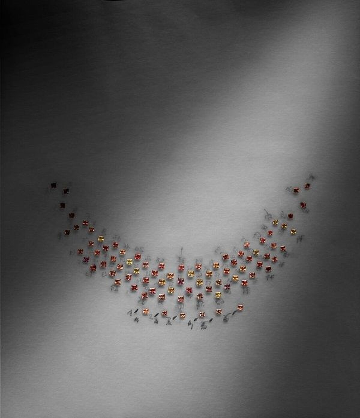 「Bones 骨骼」從結構和律動所出發,是對人類建築的致敬,其中在第一篇章中的 Bones 骨骼項鍊是品牌有史以來最複雜的項鍊,在 Chapter ll 中呼應了此概念,此次設計師以項圈式的項鍊呈現珠寶工藝的細膩與令人讚嘆之處。不同高度的方形與矩形鑽石交錯排列,點綴著一顆LV Monogram 星形切工鑽石與一顆16.92 克拉的澳洲蛋白石,另一條項鍊則以 LV Monogram 星形切工鑽石為中心,搭配 100 顆客製化鑽石,呼應著白K金與客製化切工鑽石等細節。