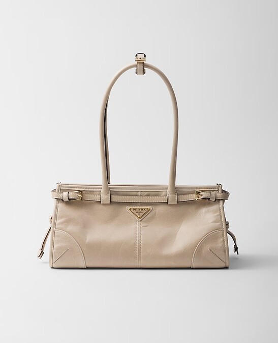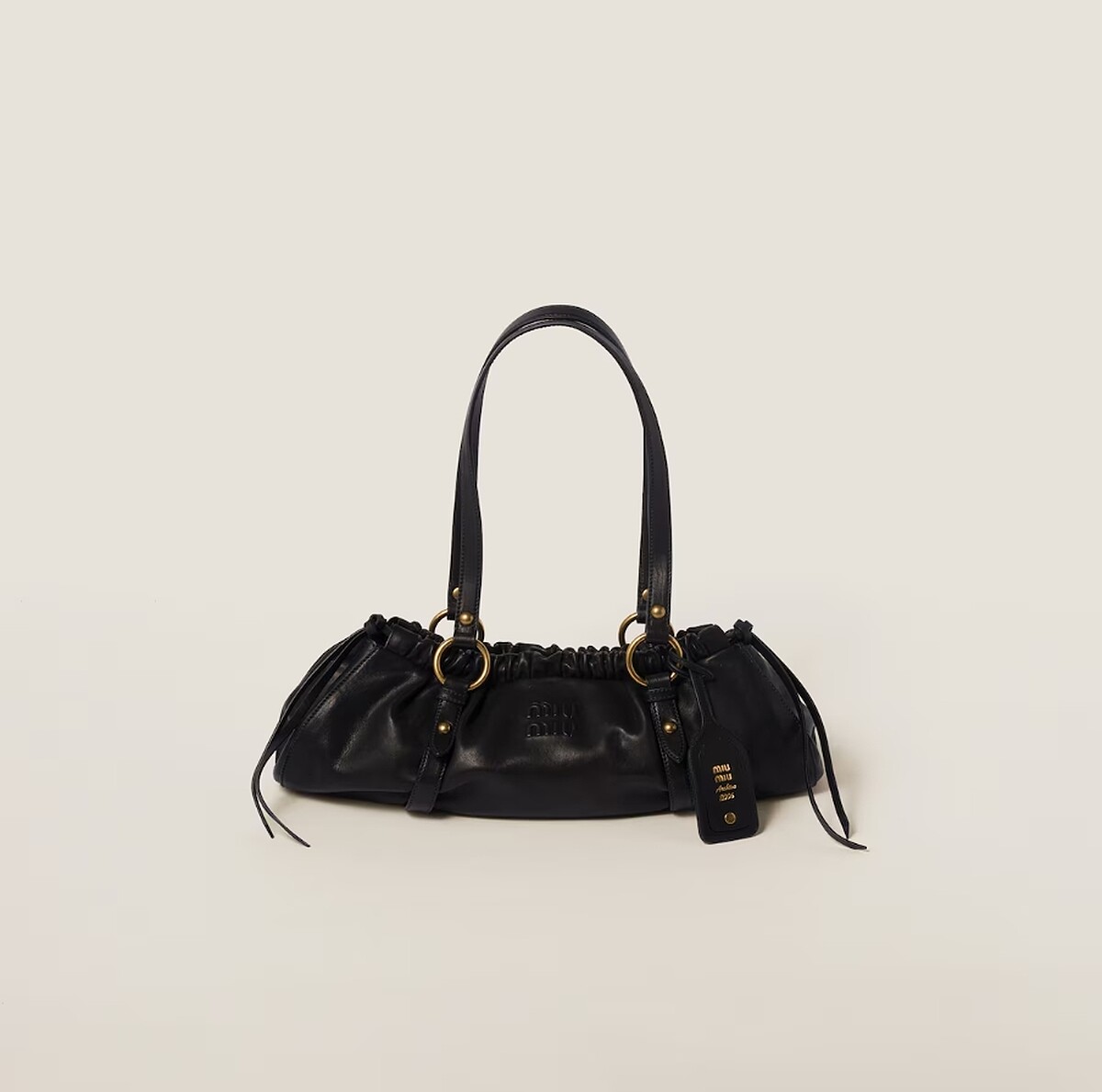 Miu Miu在近年推出了多款可歸類於East-West Bags的包款,除了經常在各國女明星們手中曝光的Arcadie matelassé 系列長方形手袋,這款上方抽皺的新款手袋,是一個目前較不易撞款的選擇。