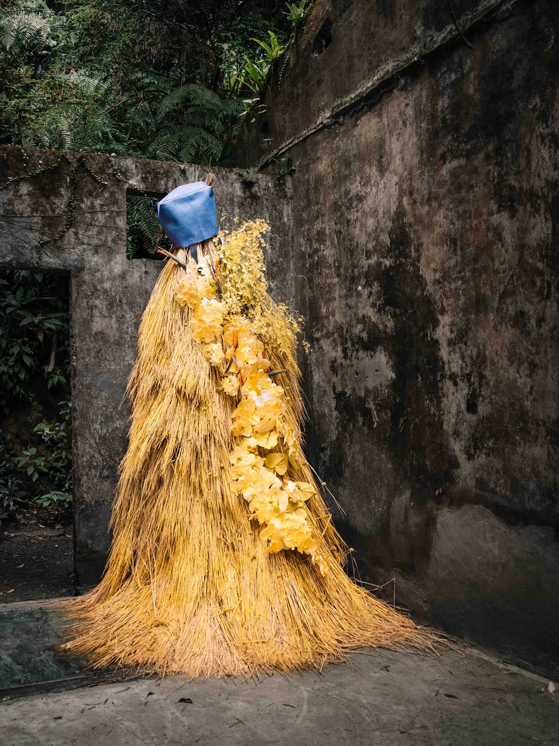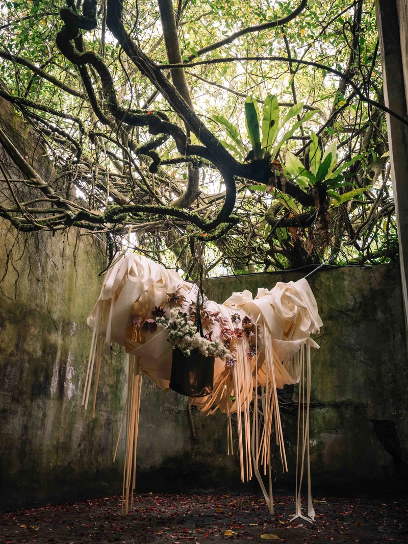 「踏進彩色境界」由多種回收材料結合 ECCO 以鞣革廠裡邊角料皮革製成的Tannery Series 工坊系列托特包設計而成的裝置藝術品,落實永續理念。
