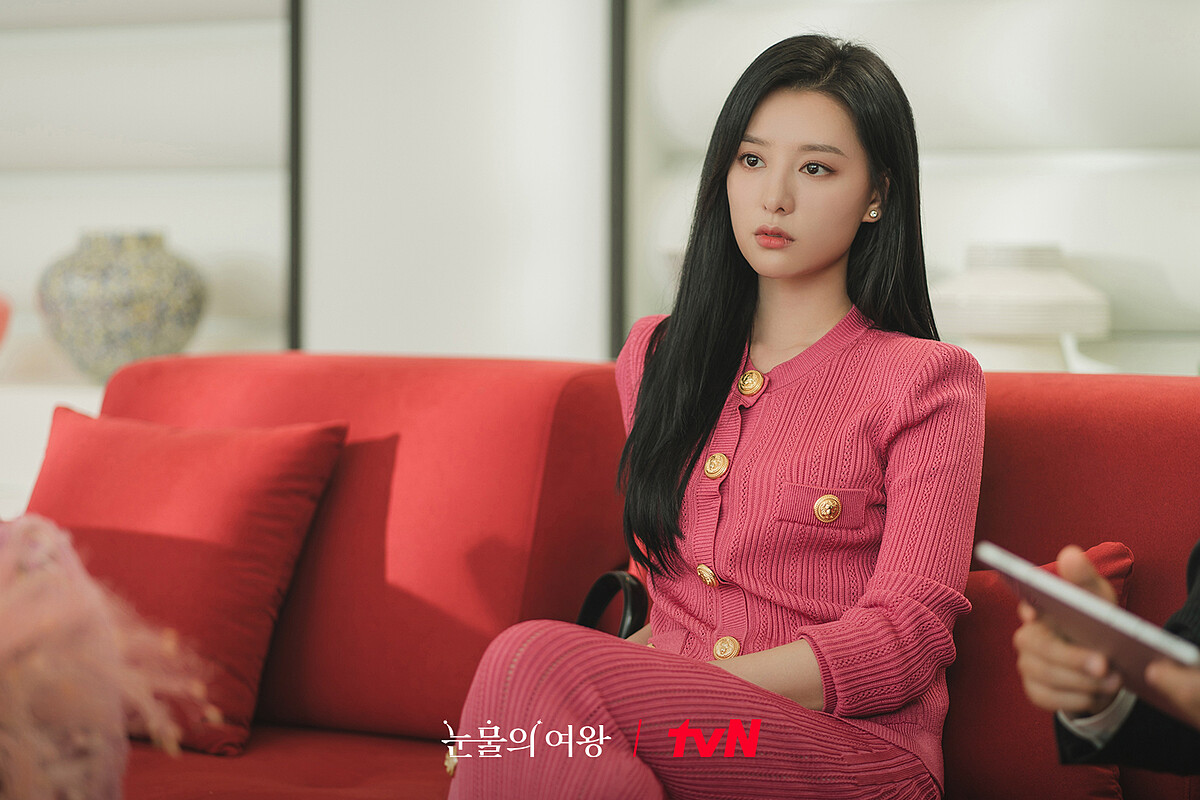 首先,在《淚之女王》中,金智媛身穿 Balmain 經典金釦系列,呈現華麗的千金姿態,金釦針織套裝帶有古典氣息,粉色系更帶出個人的優雅氣質。
