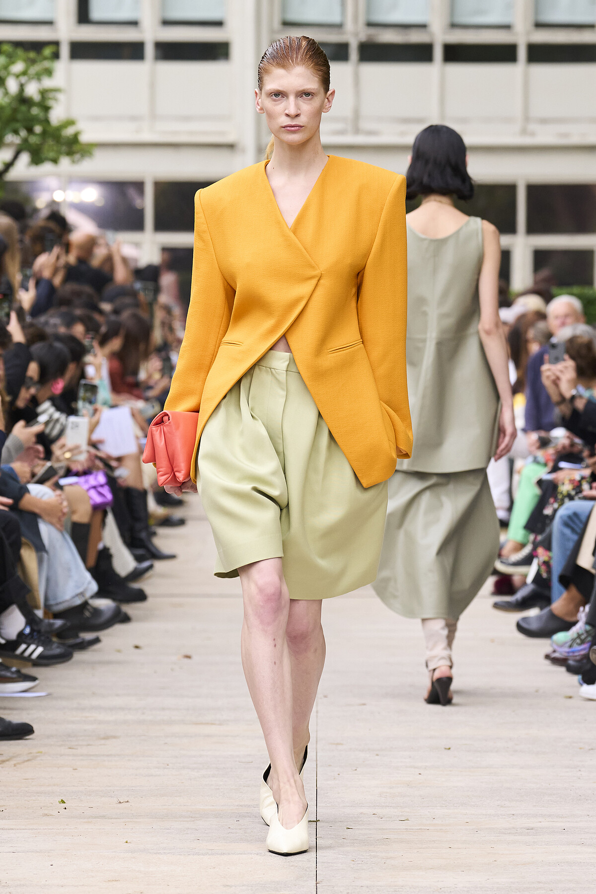 Calcaterra 將屬於春天的色彩融入造型,無領西裝搭配本季必備的寬鬆短褲,呈現時髦的童趣感。