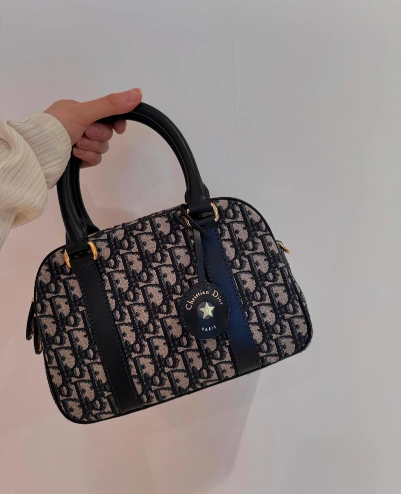 Jisoo搶先在Instagram上分享的這款Dior保齡球包,包面由藍色Oblique緹花帆布製成,上方掛著鑰匙皮套作為小掛飾,裡頭的鑰匙可解開用於鎖住拉鍊的小鎖頭,是暗藏於細節的小巧思之一,中性簡約的輪廓與各種風格的穿搭都能搭配。