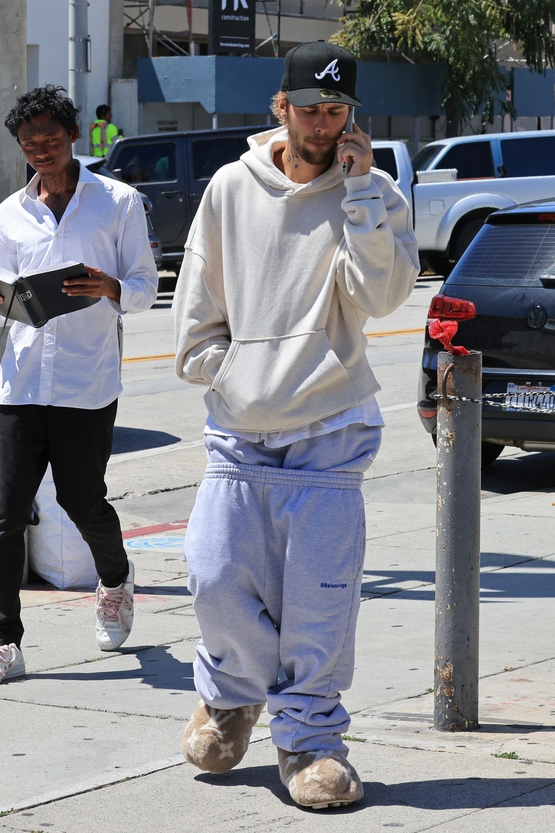 小賈斯汀日前和朋友出門吃飯,穿上了一身話題造型,上半身看來還挺正常,帽T與夾克的搭配盡顯帥氣街頭風格,但是視線往下會發現,小賈斯汀穿了兩層的Balenciaga灰色棉褲,外面那層棉褲掛在大腿位置,露出了內層的棉褲,褲檔變得非常低之外,褲腳也擠成一坨,還好有Louis Vuitton的腳印靴子,讓褲管不至於拖地。